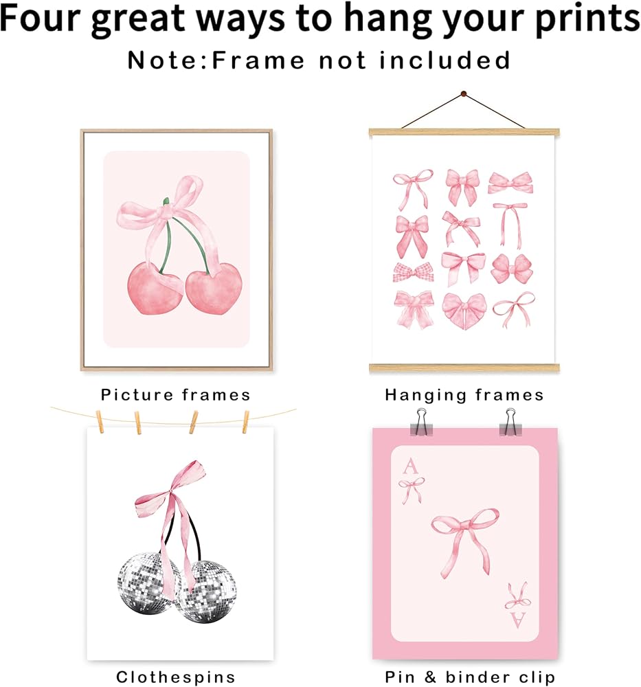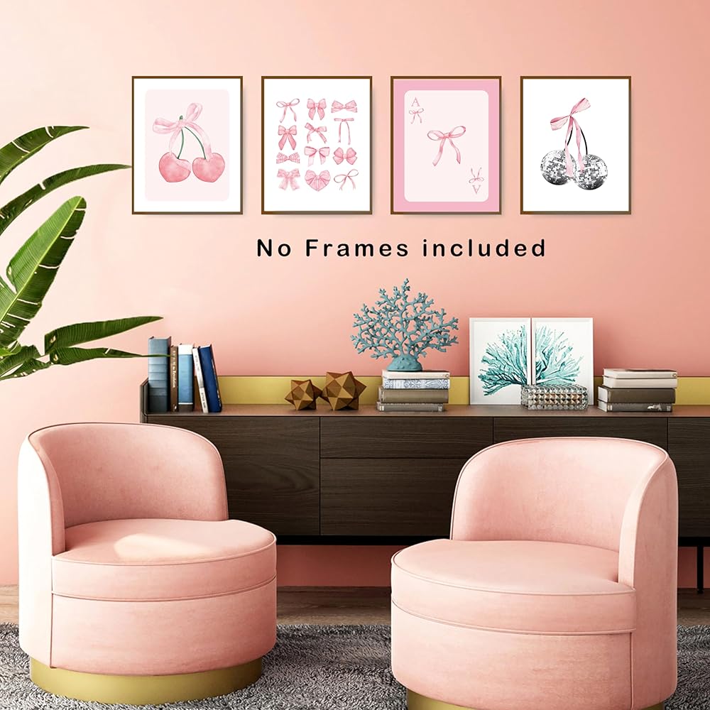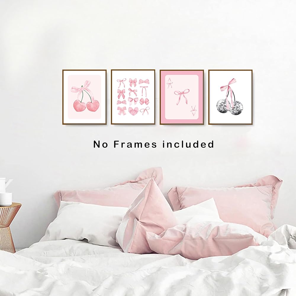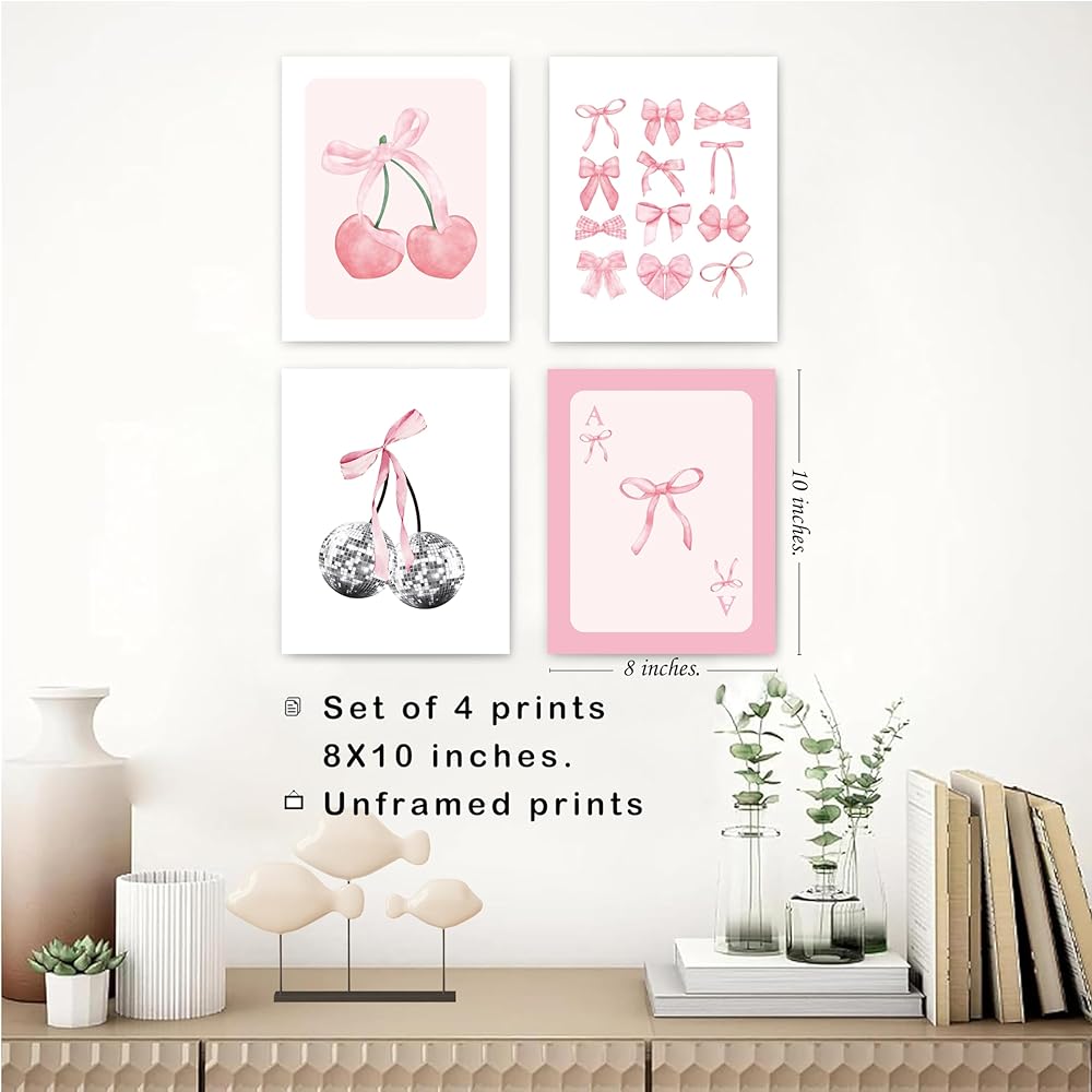 okaxscm Pink Coquette Bow Trendy Preppy Wall Art Prints Set of 4, Coquette Room Decor, Preppy Room Decor Aesthetic, Pink Bow Cherry Disco Ball Wall Decor Posters for Girls Bedroom Dorm, 8x10 Unframed