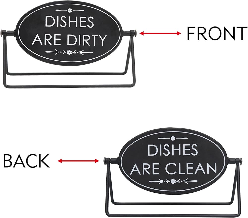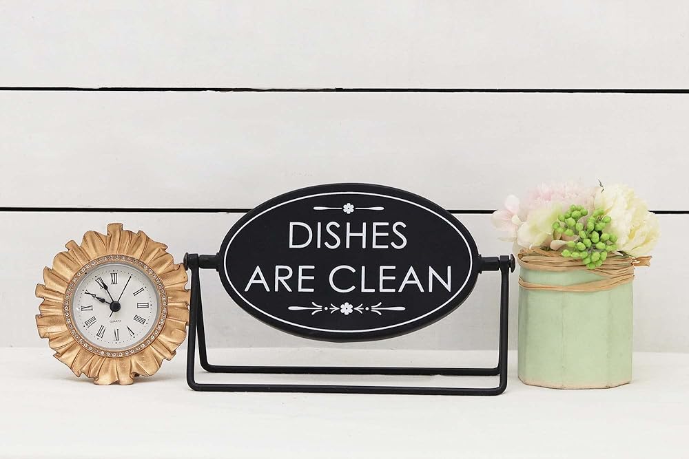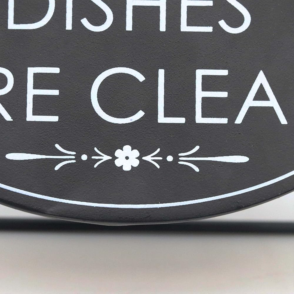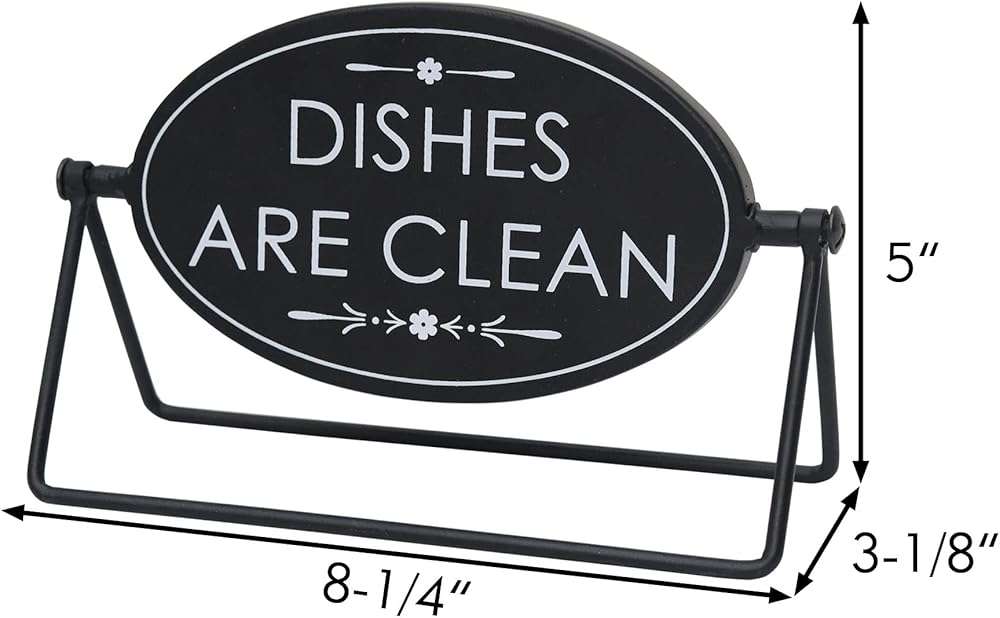 Take the guess work out of daily chores, by adding this sign to your kitchen to tell everyone if the dishes are clean or dirty. With solid reversible construction the decorative tabletop sign features the text "Dishes are dirty” on one side and “Dishes are clean” on the other.This metal sign measures approximately 8.25” x 4.8”, A perfect size to place anywhere in your kitchen, shelf, counter or tray. Makes a perfect gift for that hard to buy for person. This everyday fun sign is sure to bring a smile to your friends or family faces.