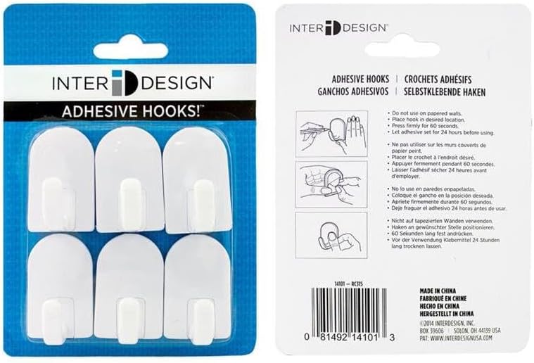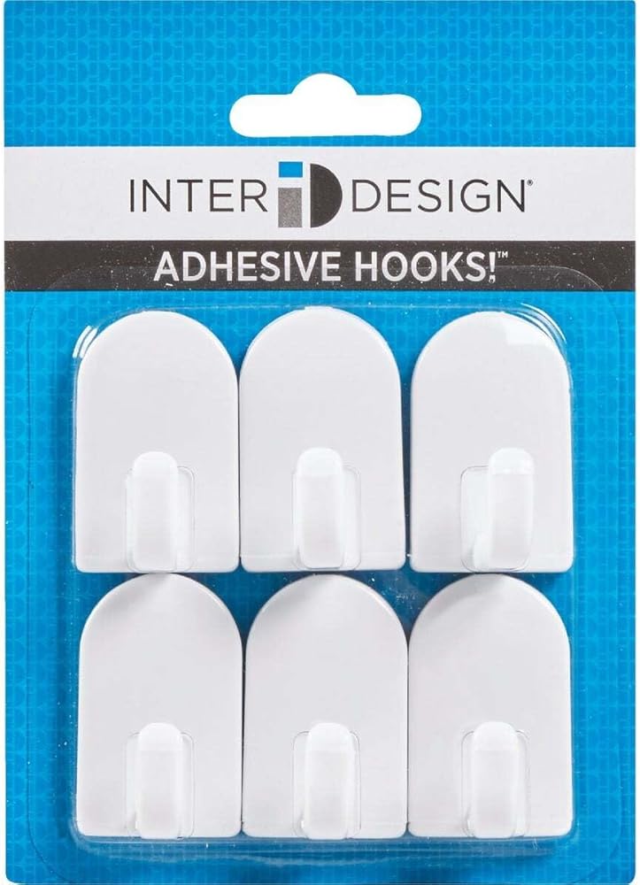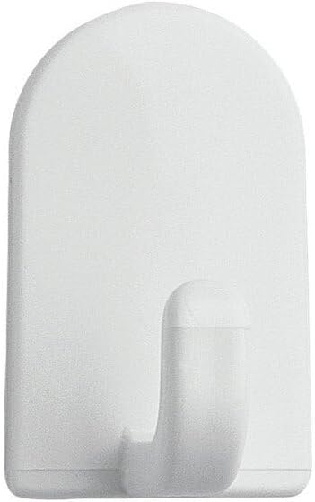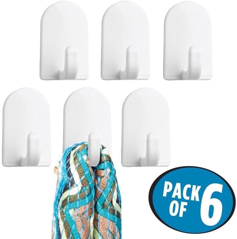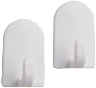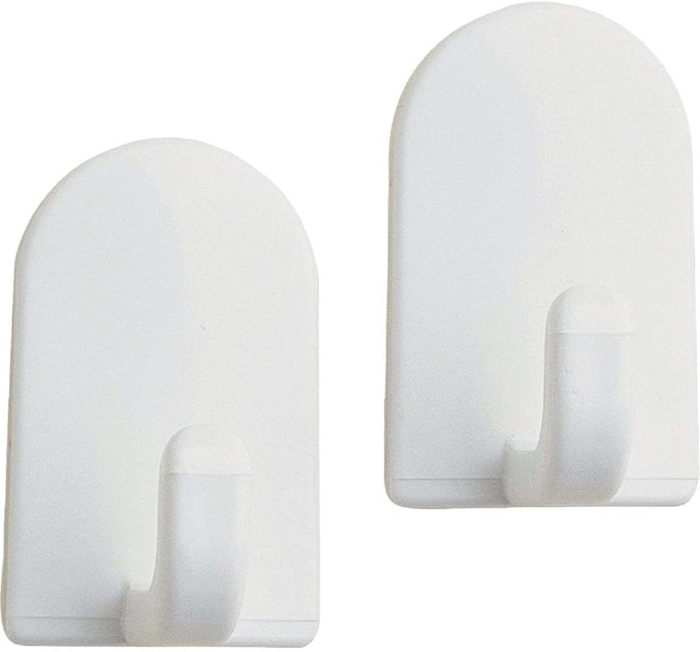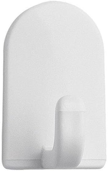 White plastic hooks with self-adhesive backing have numerous uses around the house. Place on smooth surfaces to hold keys, hand towels, cleaning supplies and more. Six hooks included.