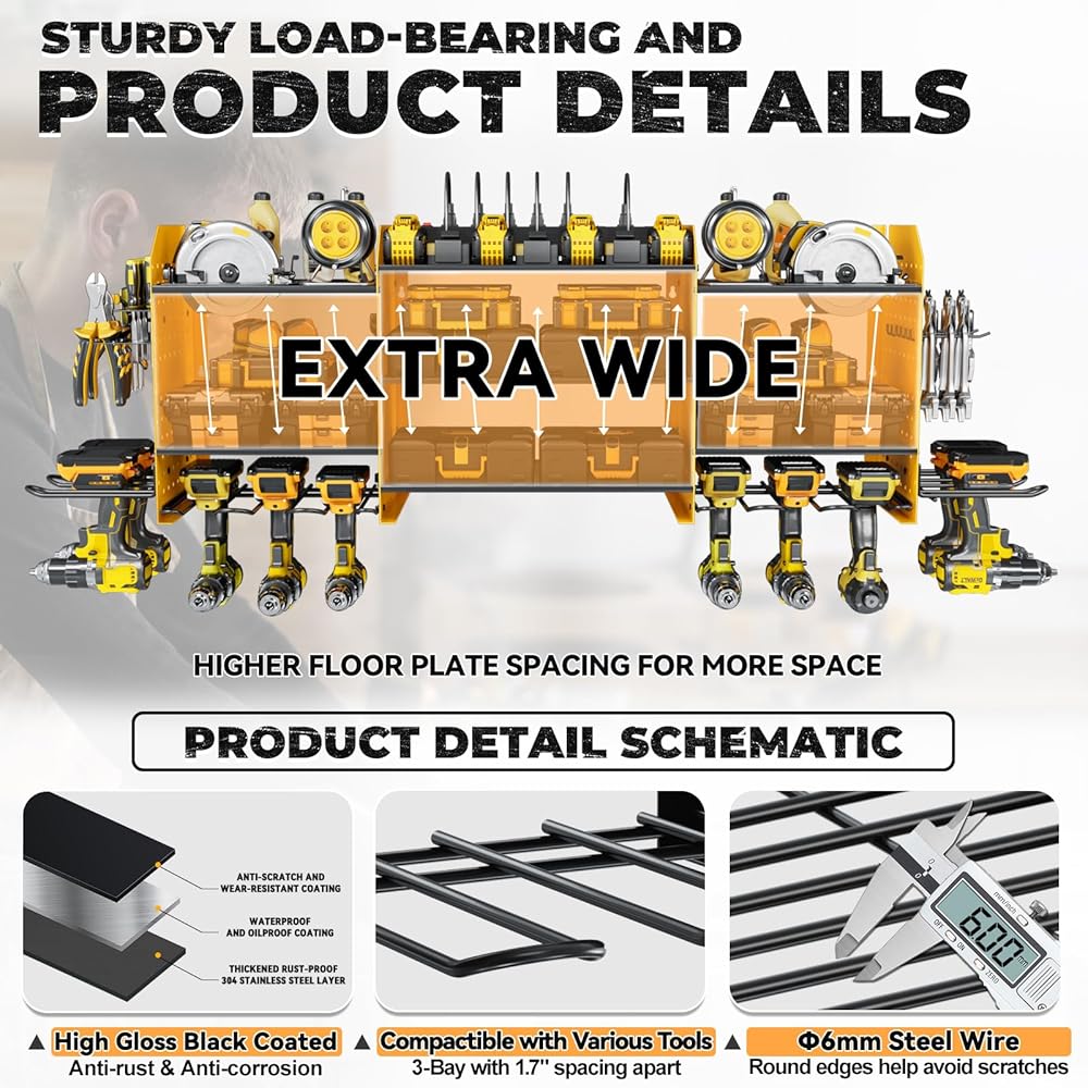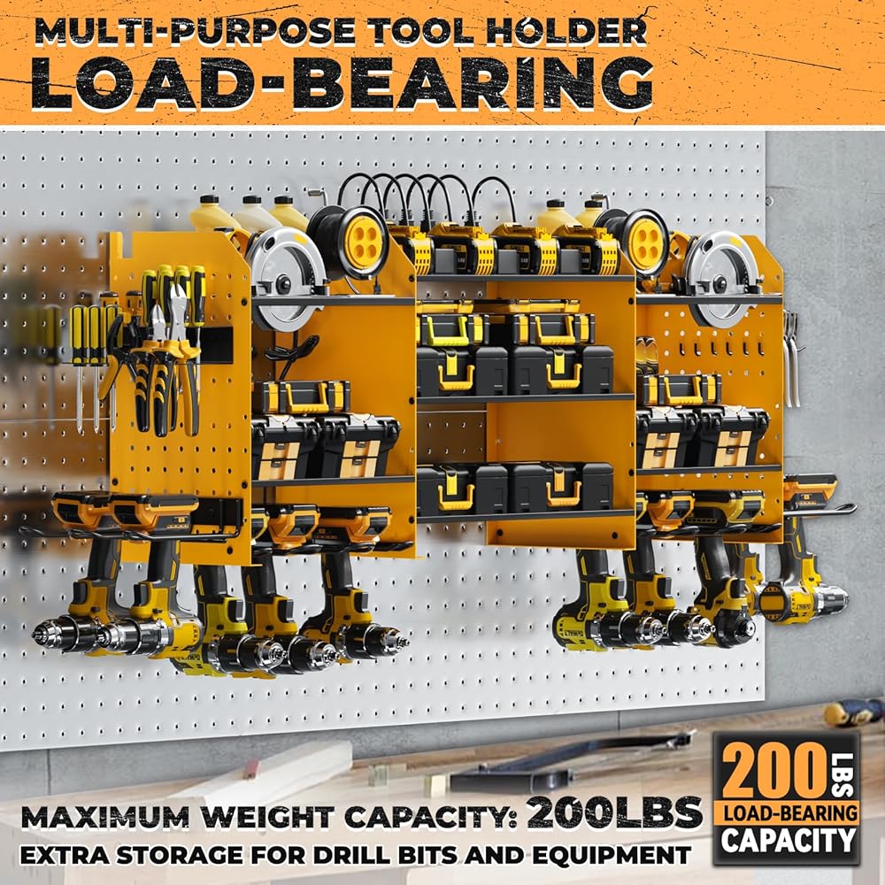 ✅【Perfect Garage Companion】Utilizing wall-mounted installation, this power tool rack maximizes unused wall space, saving time in tool retrieval. Ideal for garages, homes, workshops, sheds, backyard shops, and more, it offers suspended tool organization and storage.