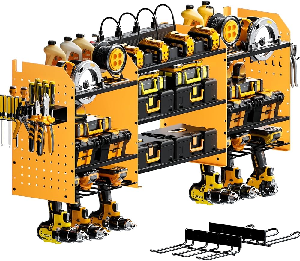 ✅【High-Capacity Storage】Wall mount power tools organizer features 10 drill holder, alongside a built-in power strip. Its double layer structure keeps rechargeable tools organized in the work area, saving bench space. Notably, the spacing between the middle tiers is significantly larger than typical market offerings.