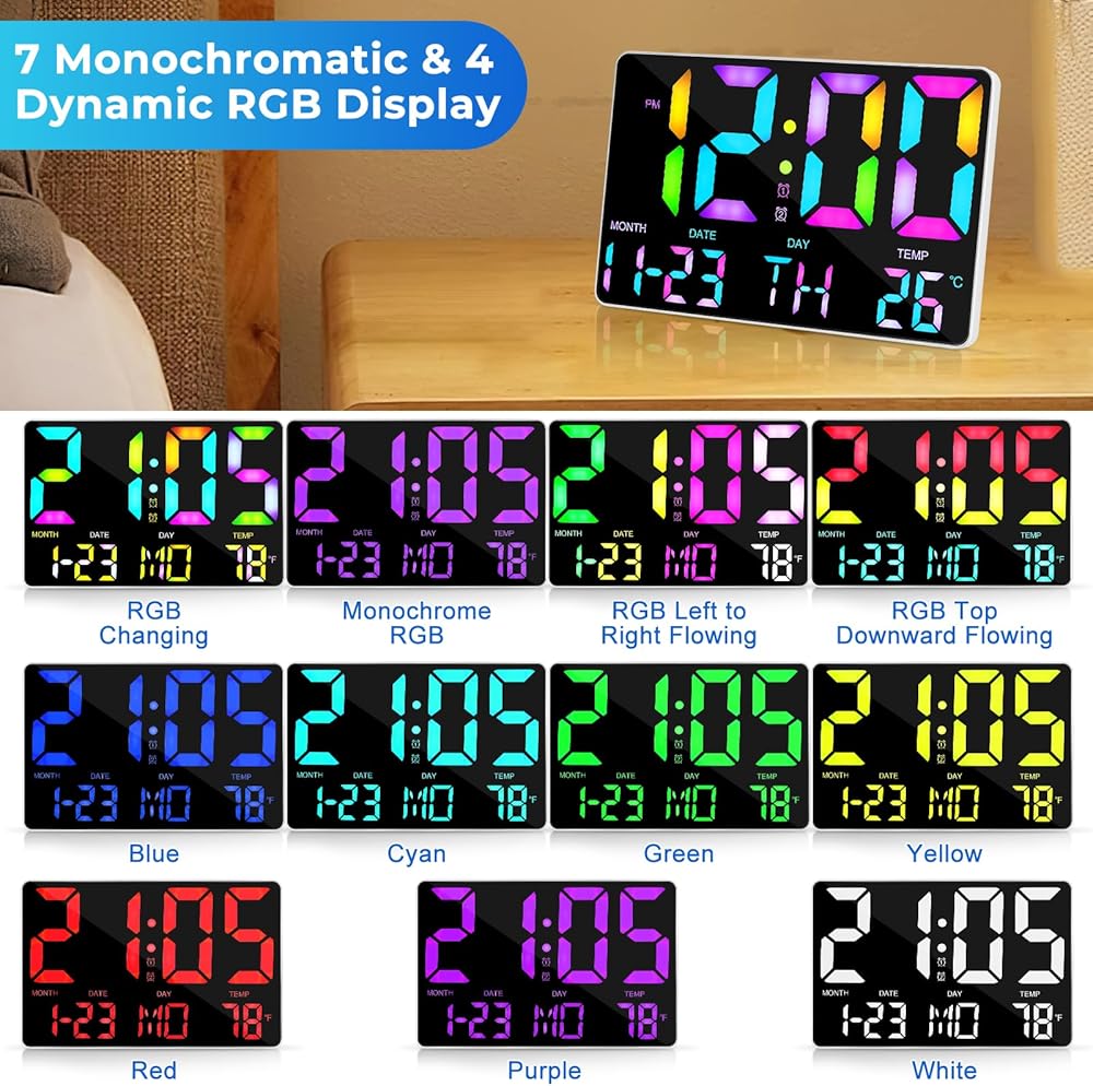 【Diverse Selection of Dynamic RGB Colors】--- The large digital wall clock has 4 RGB color modes(RGB changing, monochrome RGB, RGB left to right flowing, RGB top downward flowing) and 7 monochrome modes (blue, cyan, green, yellow, red, purple and white), catering to both simplicity and dynamic beauty. The color-changing mode adds amazing and joy to everyday life, you can choose the color that best suits your decor or preference to create a great atmosphere.