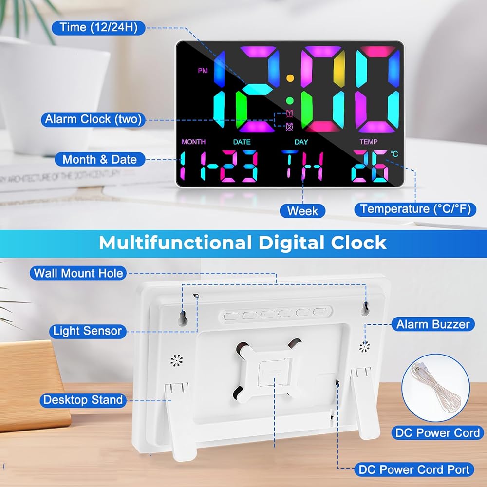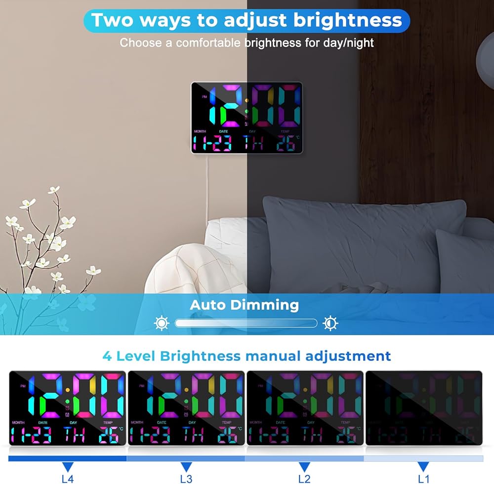【4 Level Brightness & Auto Dimming & Night Light】--- The digital clock large display supports 4-level brightness adjustment, allows you to adjust a comfortable brightness, even turn off. And the LED clock has a built-in automatic dimming sensor, which can automatically adjust the brightness as the light changes. Designed a night light at the bottom(5 level brightness), its color-changing mode add charming atmosphere to your room.
