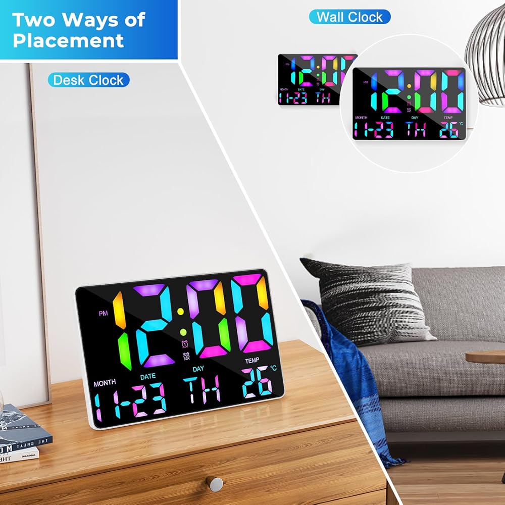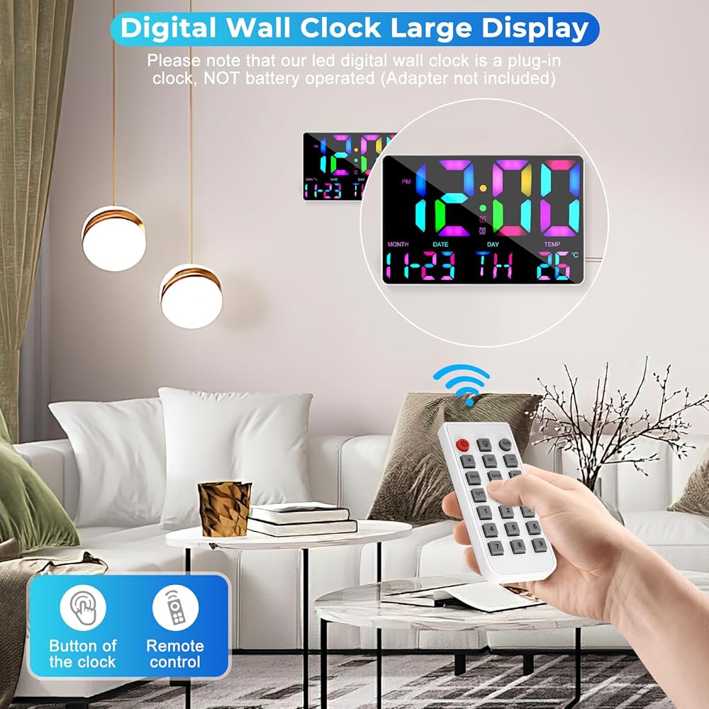 Welltop Digital Wall Clock Large Display, 11.5" Large LED Digital Wall Clock with RGB Colors Changing Remote Control, Auto Brightness Alarm Clock with Night Lights Calendar Temperature Snooze 12/24 H