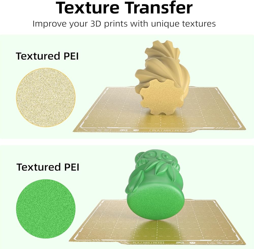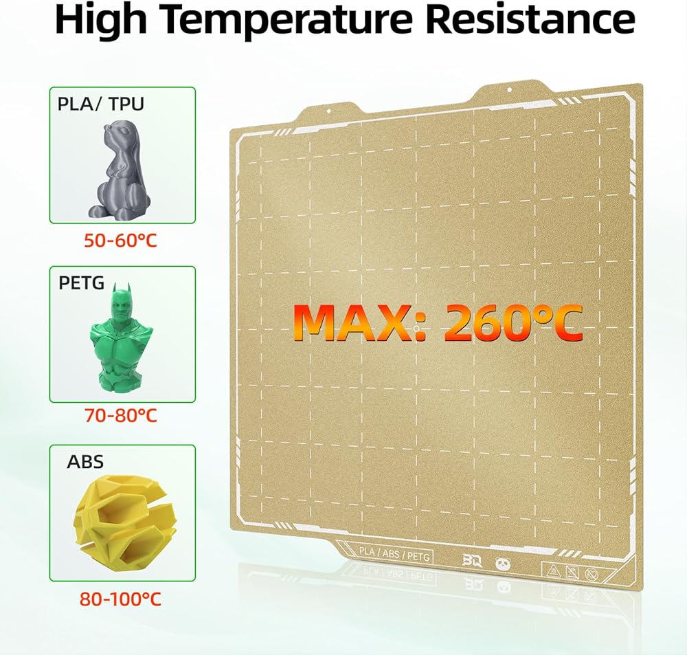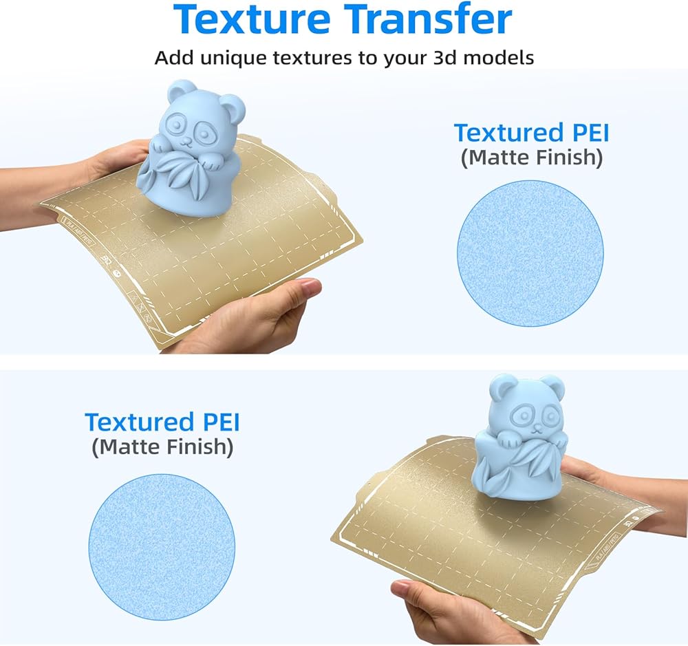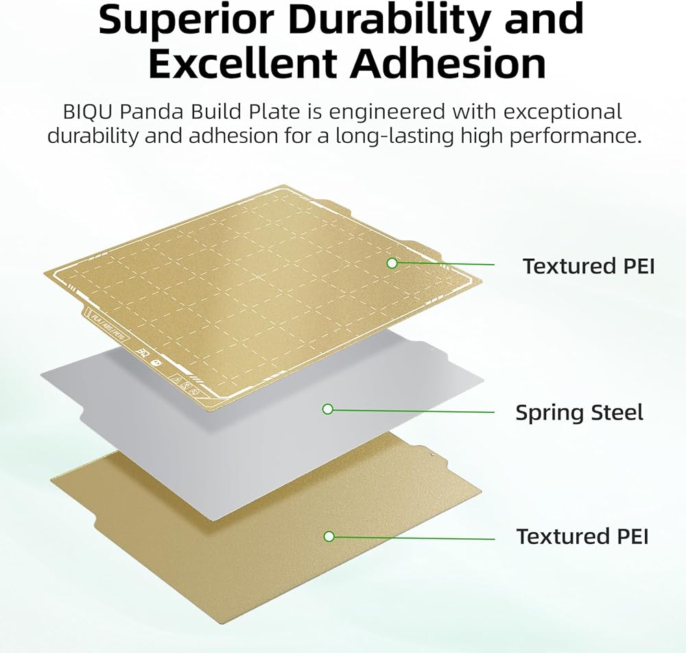 🐼【Double-sided Textured PEI Build Plate】 This BIQU build plate is made of spring steel sheet, both side of which are covered with textured PEI to offer a unique frosted finish to the bottom of your prints. With BIQU double-sided textured PEI build plate, you can double the usage time, making it a cost-effective choice.