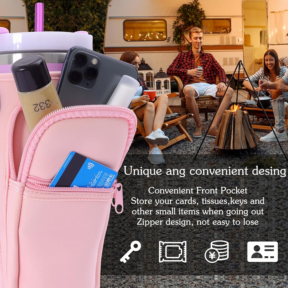 💜【Water Bottle Carrier with Phone Pocket】-- With a large pocket for your cell phone and a small pocket for cash, cards and other essentials, our stanl-ey bag frees up your hands and eliminates the need for an extra backpack, convenient for you to carry around.