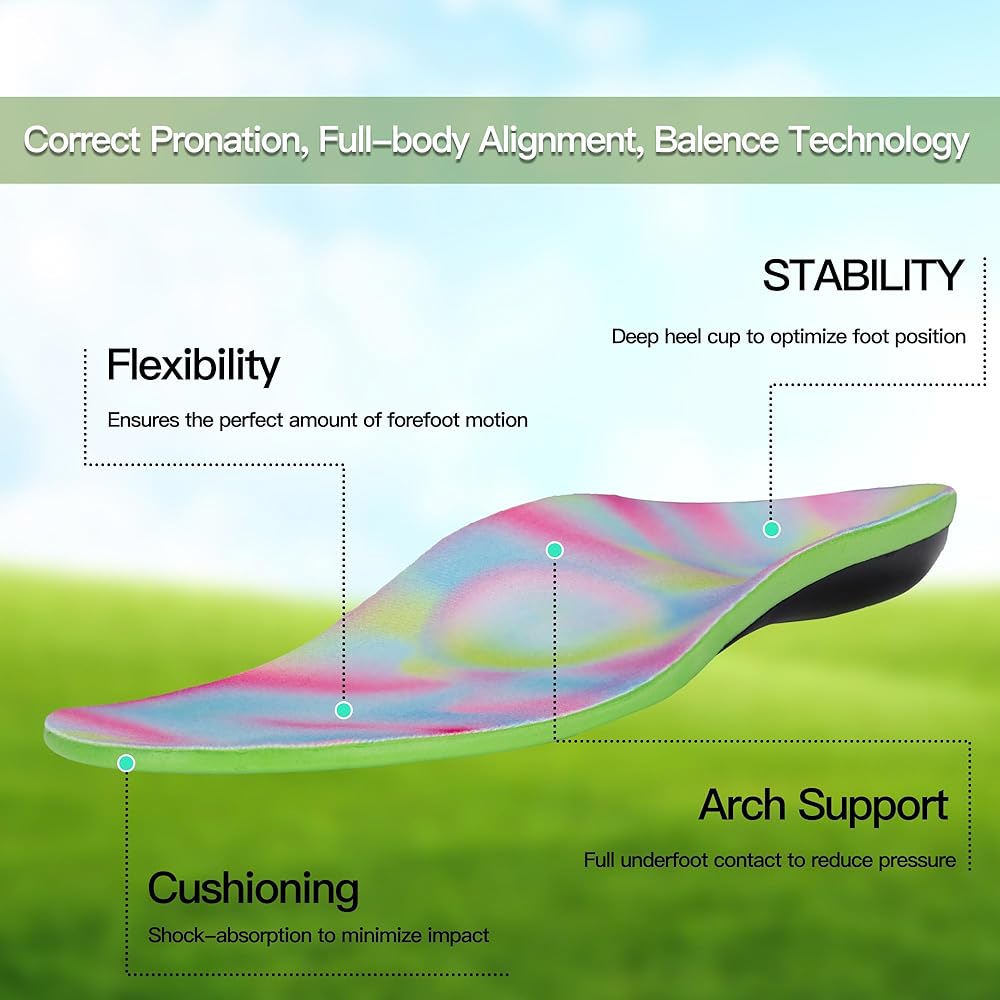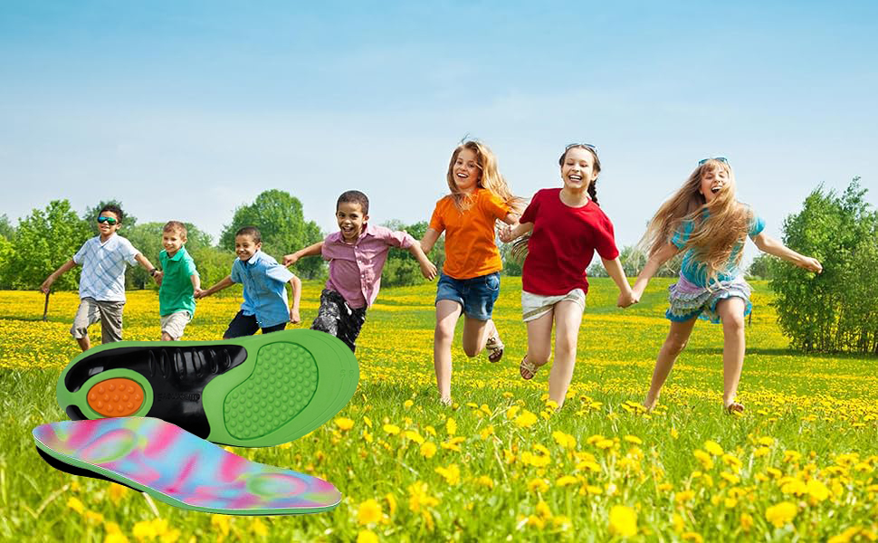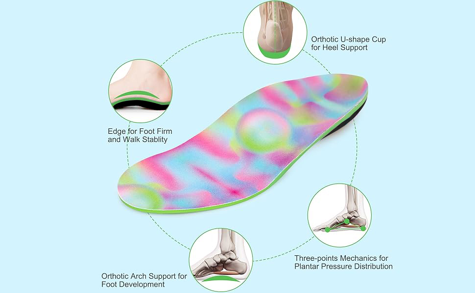 [ERGONOMIC DESIGNED FOR KIDS]: The perfect curve of the kid insole is designed in accordance with the kids' foot structure, ergonomic and biomechanical, and out of doctor's data from patients and Ergonomic knowledge. Orthotics are crafted from premium EVA foam, a smooth layer of velvet fabric layer is added to keep breathable and make the feet cool by sucking up all the sweat and moisture. Kids will love the fun and cute rainbow design and be happy to put them in their shoes.