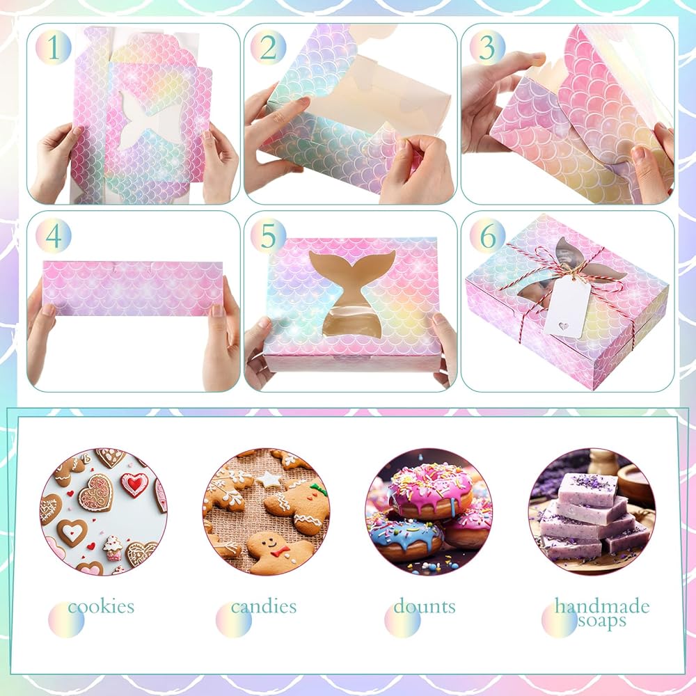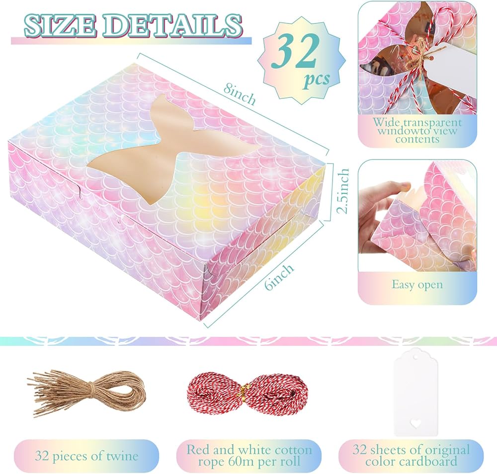 Features: Our pastry boxes with window can add a festive charm to your gifts or bakery items. Plus, the tags and ropes lend a rustic touch to the overall presentation. Thanks to flat delivery and easy assembly, these gift boxes with clear window offer a fantastic storage solution. Whether you're a bakery owner or a party planner, say hello to beautifully organized treats in boxes. Specifications: Main material: cardboard Color: as the picture shown Size: Bakery box: about 8 x 6 x 2.5 inches/ 20 x 15 x 6 cm Gift tag: about 1.8 x 2.8 inches/ 4.5 x 7 cm Hemp rope: about 7.1 inches/ 18 cm in each length Cotton rope: about 65.6 yd/ 60 m in length Package includes: 32 x Bakery boxes with window 32 x Gift tags 32 x Hemp ropes A roll of red and white cotton rope Notes: Manual measurement, please allow slight errors on size. The color may exist a slight difference due to different screen displays.