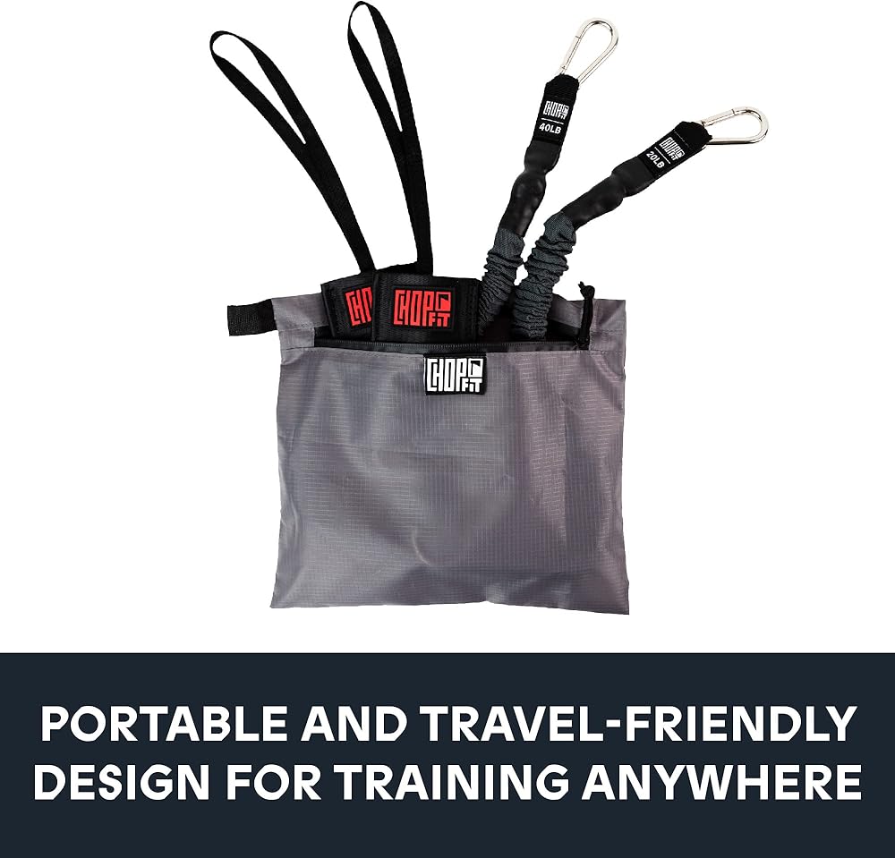 FUNCTIONAL AT HOME GYM RESISTANCE TRAINING SYSTEM - The ChopFit Resistance Band Set is designed for all fitness levels to improve full-body strength and conditioning with effective workouts at home, outside or while traveling. It's uniquely constructed to work with the ChopFit Chopper Functional Trainer System (not included) for training your abs, arms, legs, chest, back and shoulder muscles.