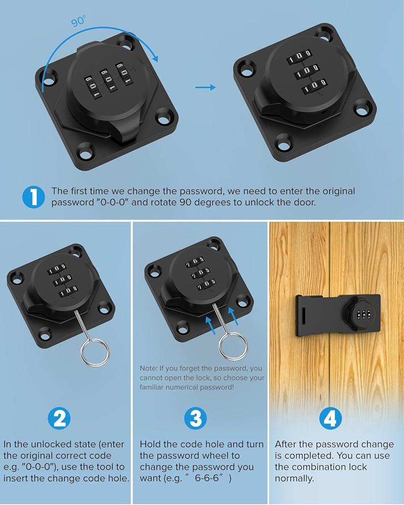 【Safe and Solid】Our cabinet locks feature an easy-to-use password setting feature that puts you in control of your security. The 3-digit number provides 1,000 possible passwords. You can set your own code and change it freely.