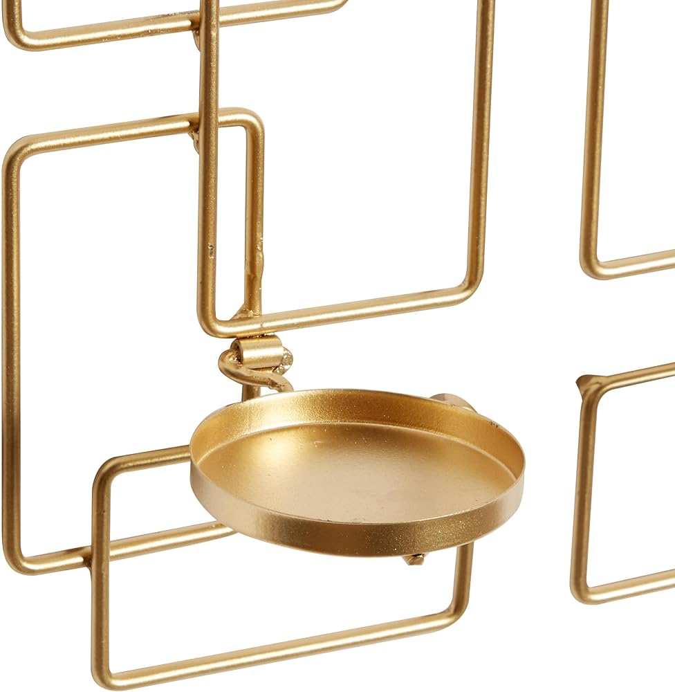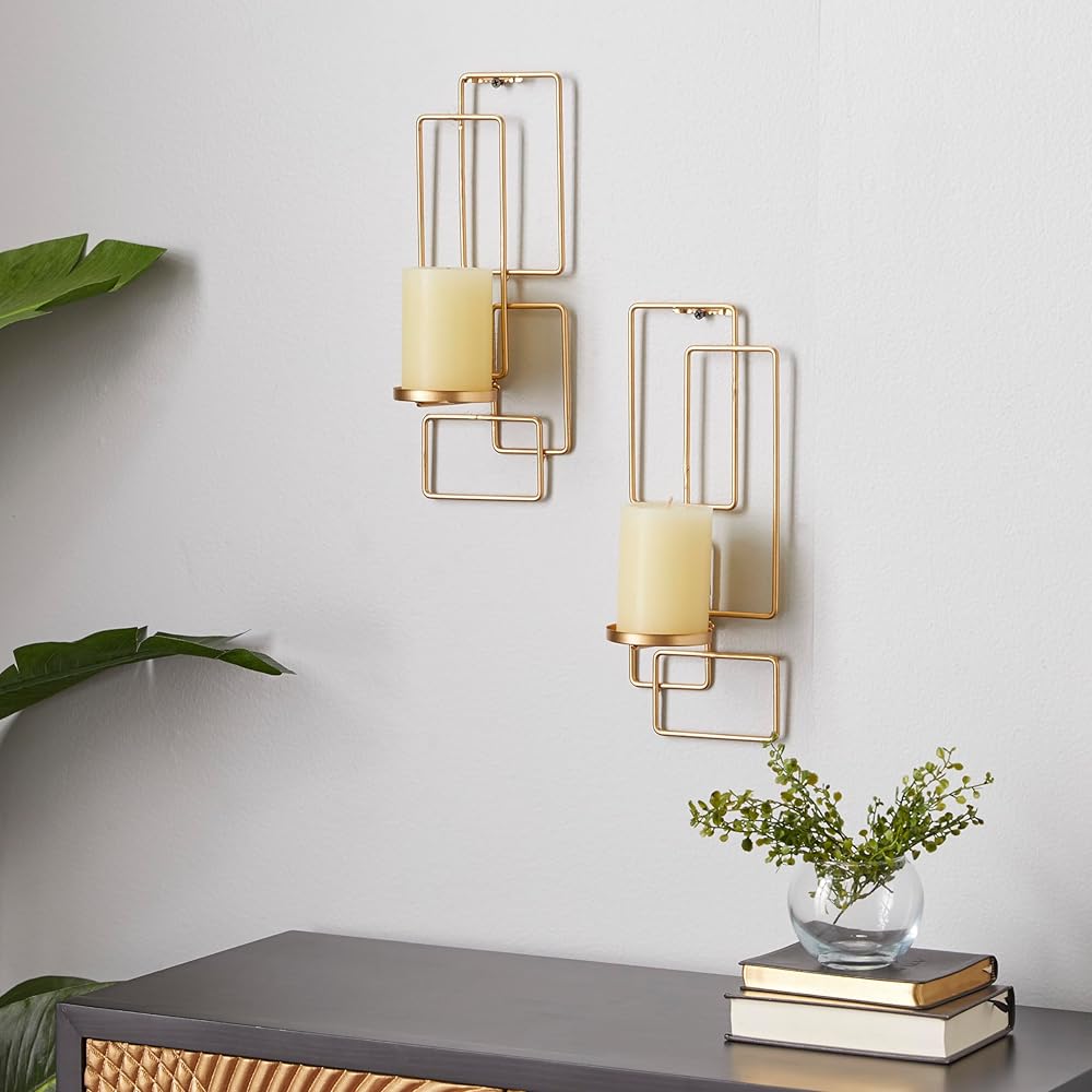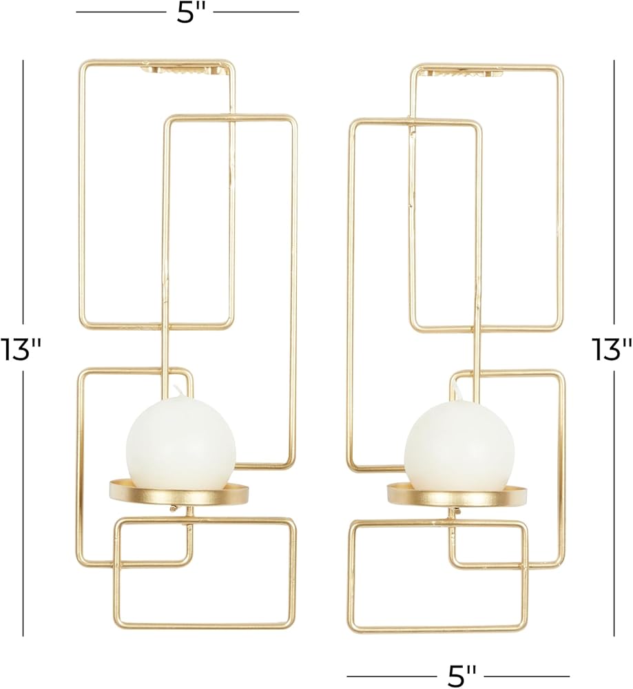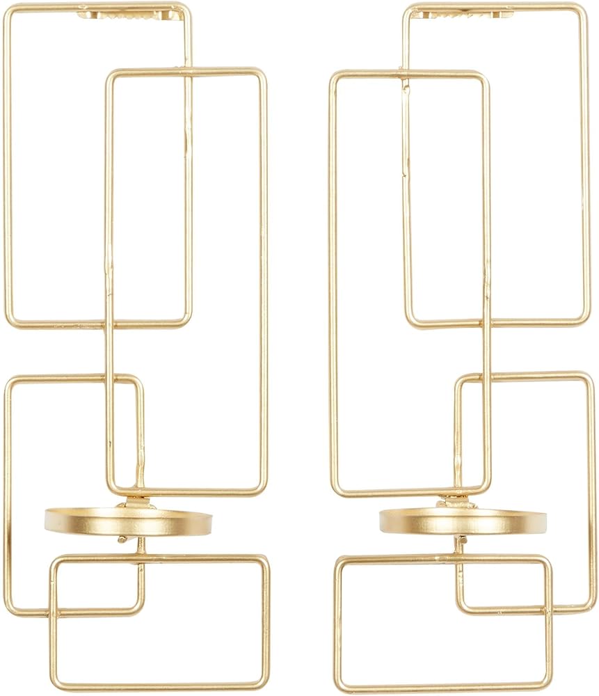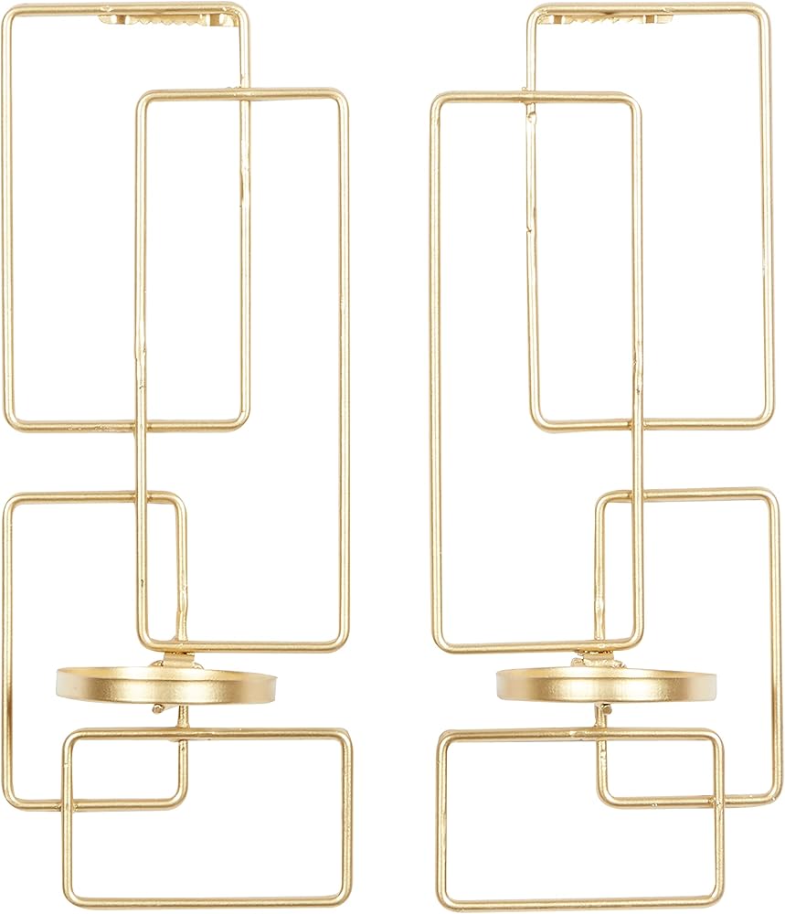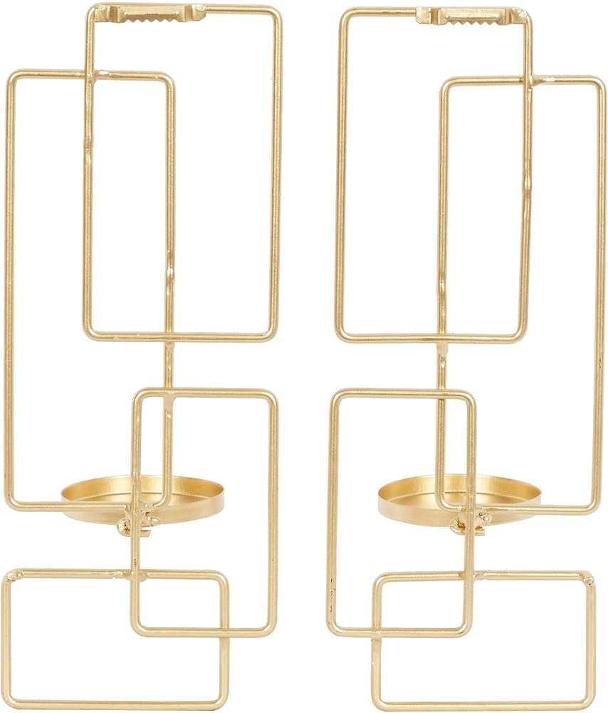 Iron is intricately carved to form a geometrical wall sconce design. These trendy wall sconce candle holders feature a unique geometrical design with cupped candle plates. Wipe clean with a dry cloth. This geometric wall sconce candle holder set is a great decorative addition for entryways, living rooms, kitchens, and bedrooms. Can hold 2 pillar candles, not included. This item ships in 1 carton. Can be hung vertically using the sawtooths; nails and screws not included. Suitable for indoor use only. This item ships fully assembled in one piece. This gold colored metal candle sconce comes as a set of 2. Contemporary style.