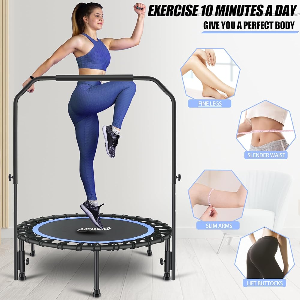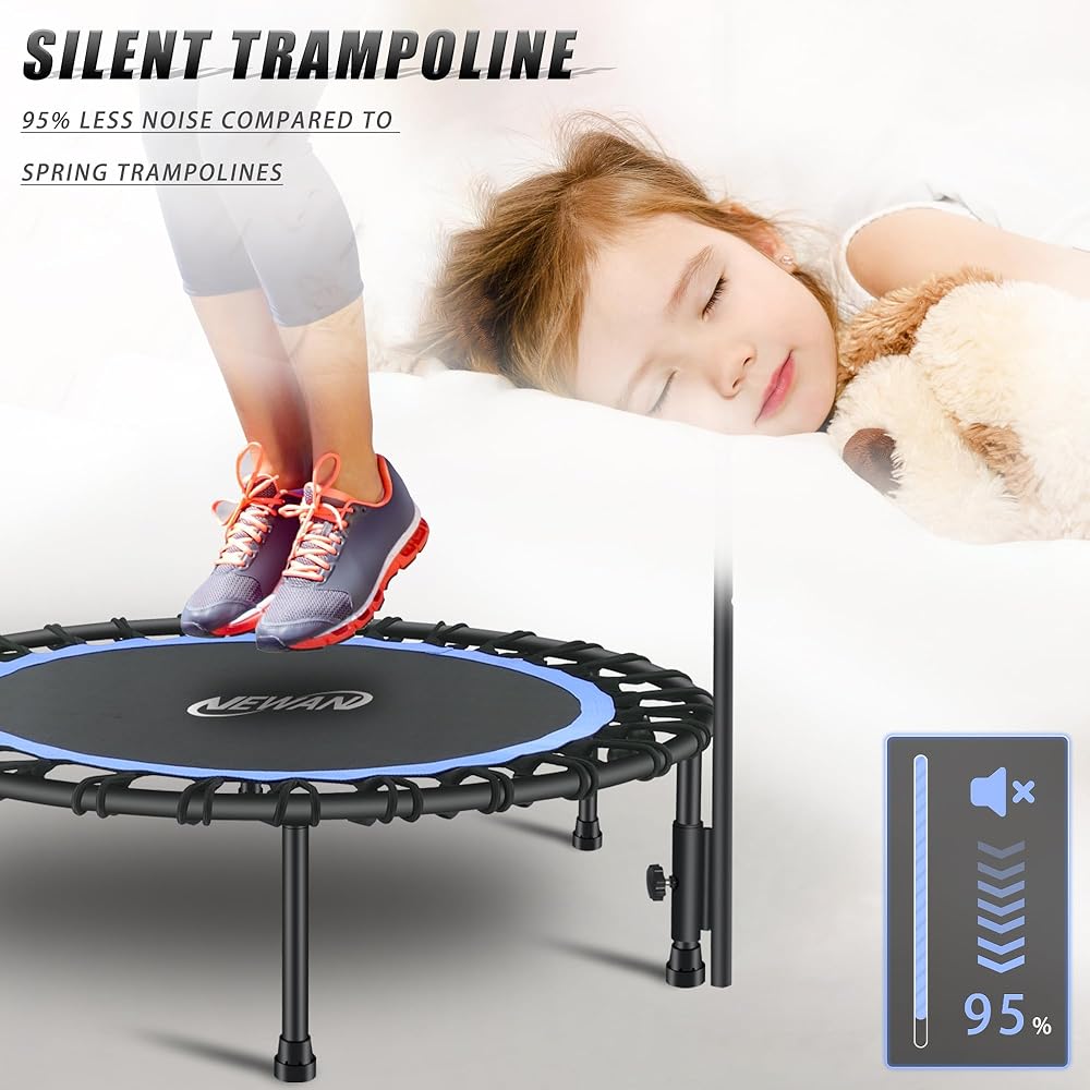 ✅【Multifunctionen】:Newan indoor trampoline is also a perfect equipment for losing weight.10 Minutes bounce exercise equals 1-hour jogging, 30 minutes cycling or 20 minutes swimming.Newan fitness trampoline trains a wide range of muscle groups, help build muscle mass, strengthen the shoulder, hip, and leg muscles.