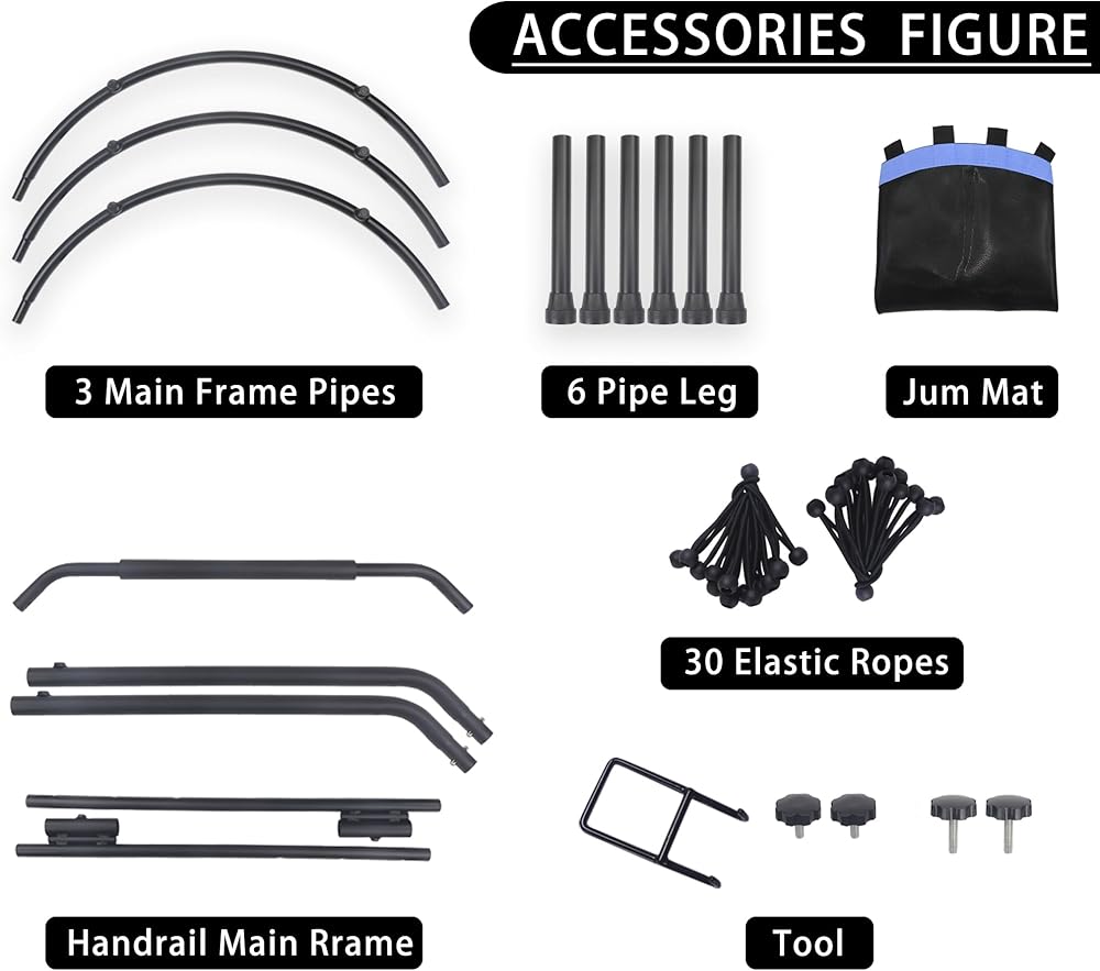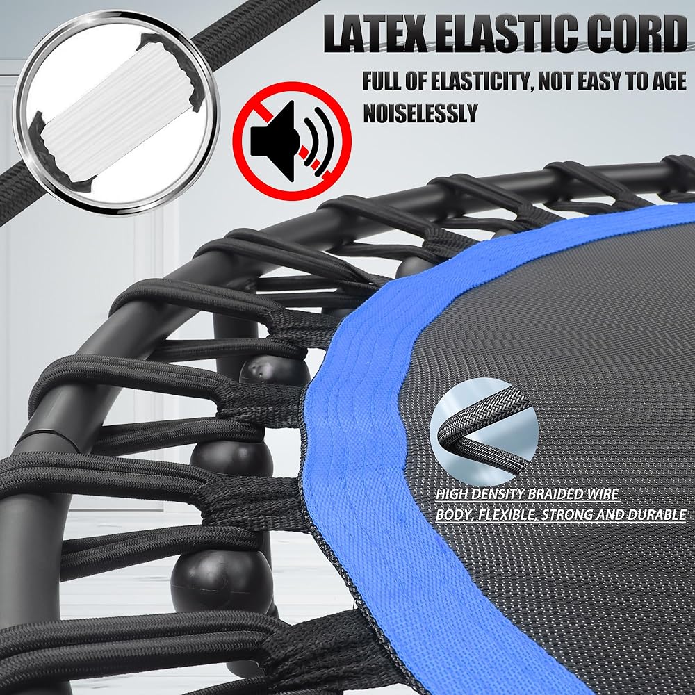 ✅【Good Elasticity】:The bungee-rope design system with 30 thickened ropes which are 0.32"(8MM) of diameter provides joint-friendly suspension,soft but strong bounce back, provides silent and safely bounce back, reduces noise in maximum extent, affords more stability, and gives you a great jumping experience. Special tool is included for assembly.