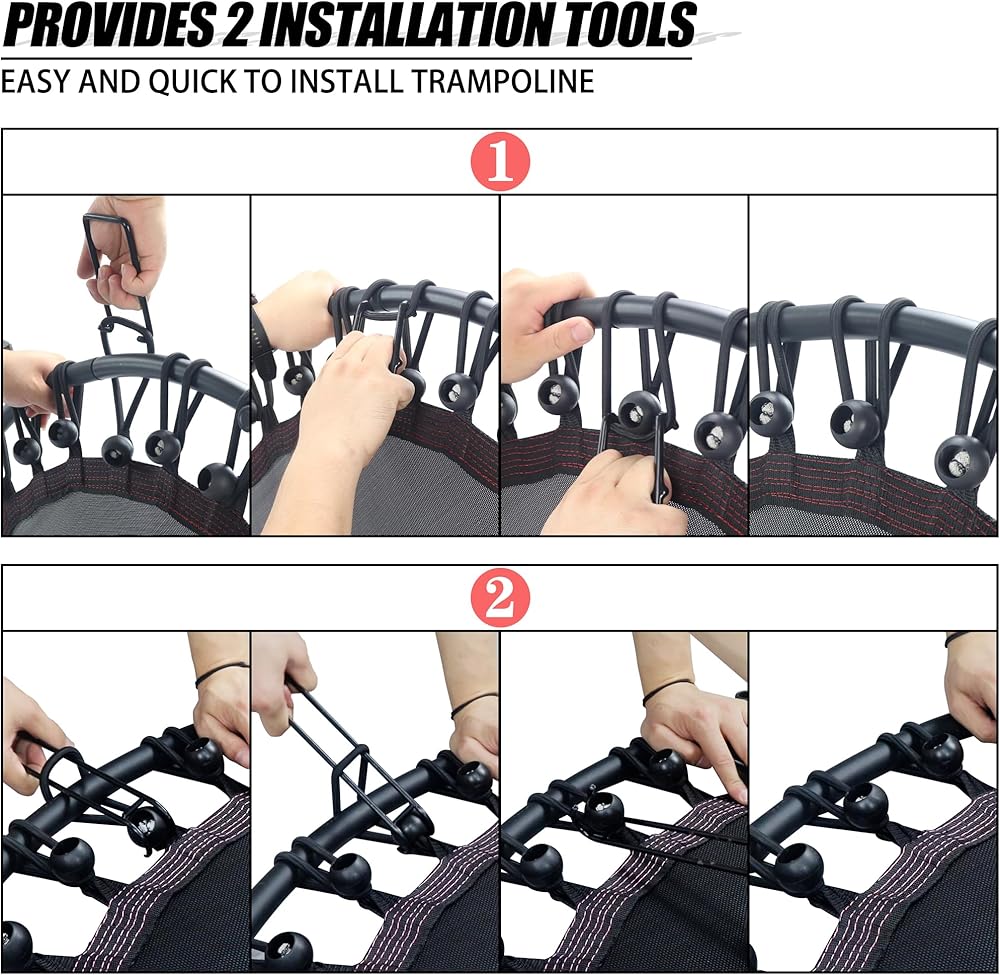 ✅【Warm Tips】: Please read the user manual or watch the installation video before installation.Assembling the frame wasn't too difficult for this product, but attaching each bungie cord takes a significant amount of strength even with the tool provided. However, once the product is built, it is an excellent device. Very very quiet compared to the spring-loaded trampolines.