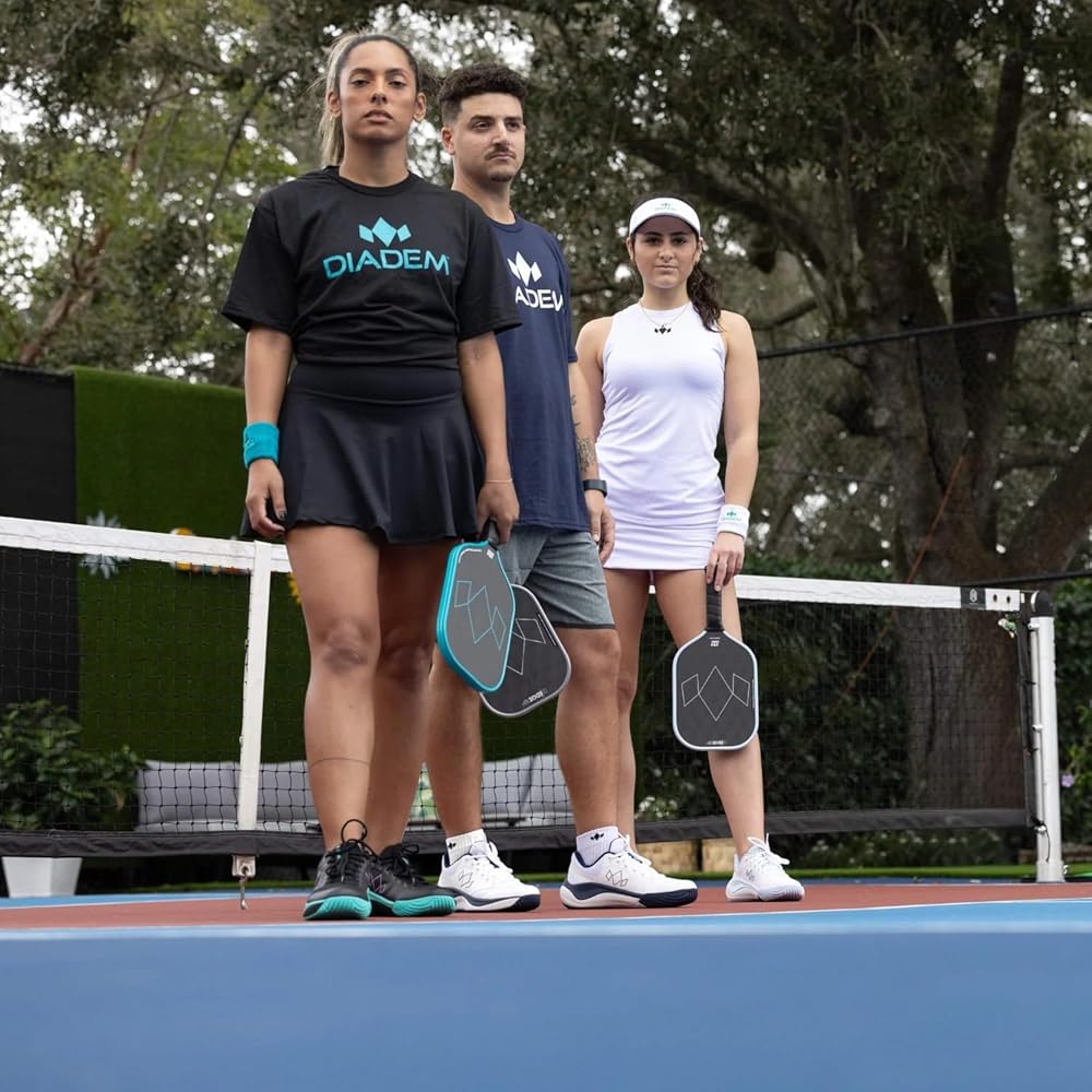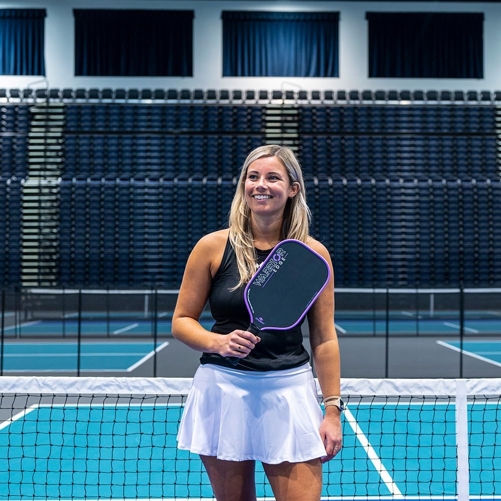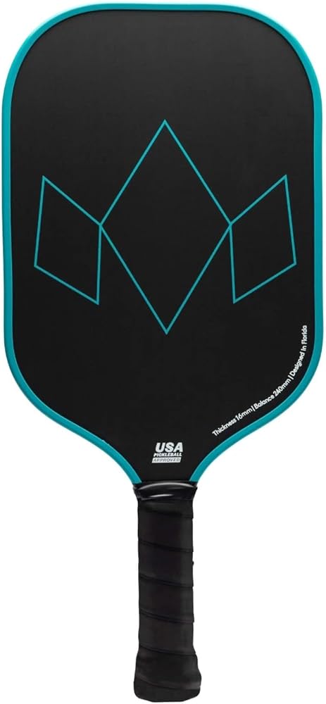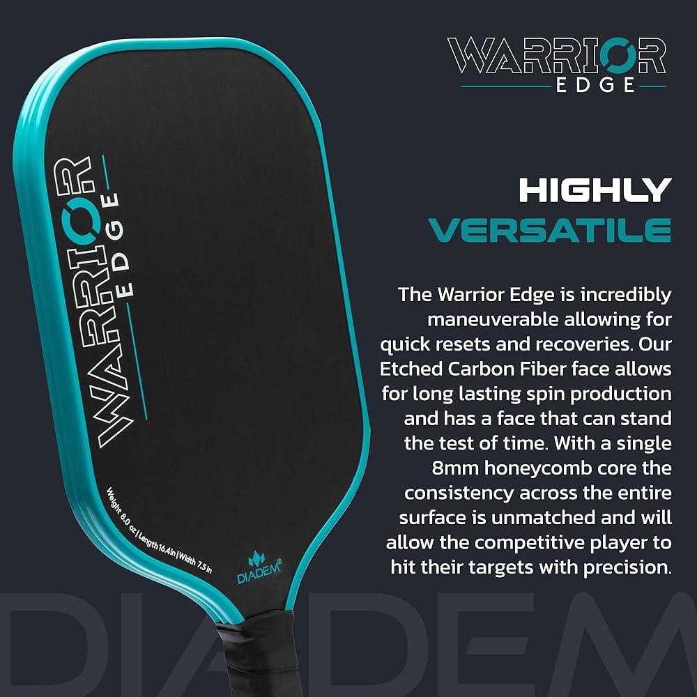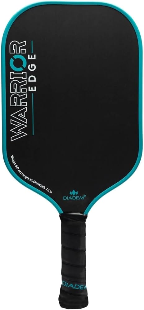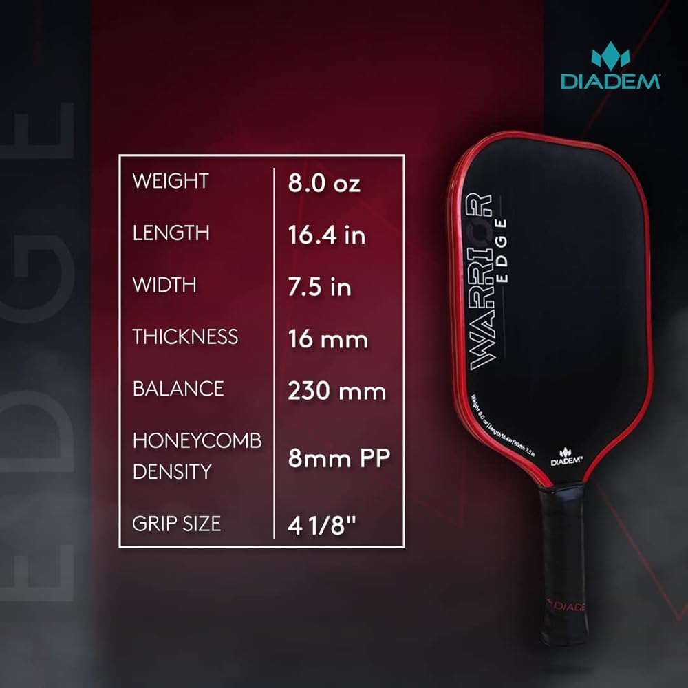 The Warrior Edge Carbon Fiber Paddle from Diadem features a 16mm (0.63") thick core, which is thicker than most paddles but slimmer than the original Diadem Warrior (which happens to be the first 19mm thick paddle ever introduced to the pickleball paddle market). This allows the Warrior Edge to retain high-performance power with more speed and maneuverability than its predecessor. With a polymer honeycomb composition, the control-oriented thick core also contributes to fewer impact vibrations so players can maintain a steady hold on their paddle during quick exchanges. The Warrior Edge Pickleball Paddle weighs in at 7.8 – 8.2 oz., keeping it comfortably in the midweight range. It has a small 4-1/8" grip circumference, which is easily fattened up a bit with an overgrip. The handle length is 5" which provides a pleasant amount of room for most players. Its surface is composed of etched carbon fiber which aligns vertically to "bite" the ball (and won't wear down like a gritty painted surface), enabling you to utilize spin more easily on your cuts, slices and spin serves. Finally, the Aero Guard edge guard accelerates air flow across the thickness of the paddle, resulting in quicker resets and a more durable edge guard overall with valleys and ridges to absorb impact. The Warrior Edge Carbon Fiber Paddle from Diadem mixes power with comfort so you can play hard and come back for more. Actual grip sizes may vary up to 1/8".