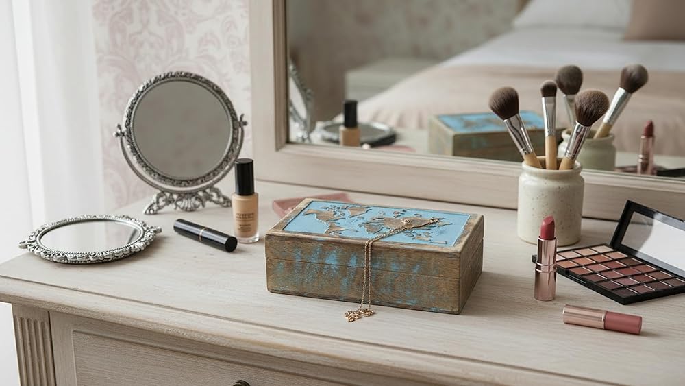 HIGH QUALITY: Strong hinges. Lasts forever. Rustic look & feel with a gorgeous turquoise wash finish, which sets this box apart. A beautiful handmade carving of THE WORLD MAP decorates the box surface