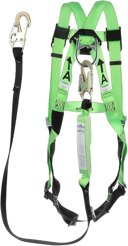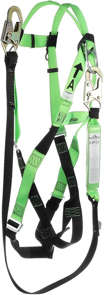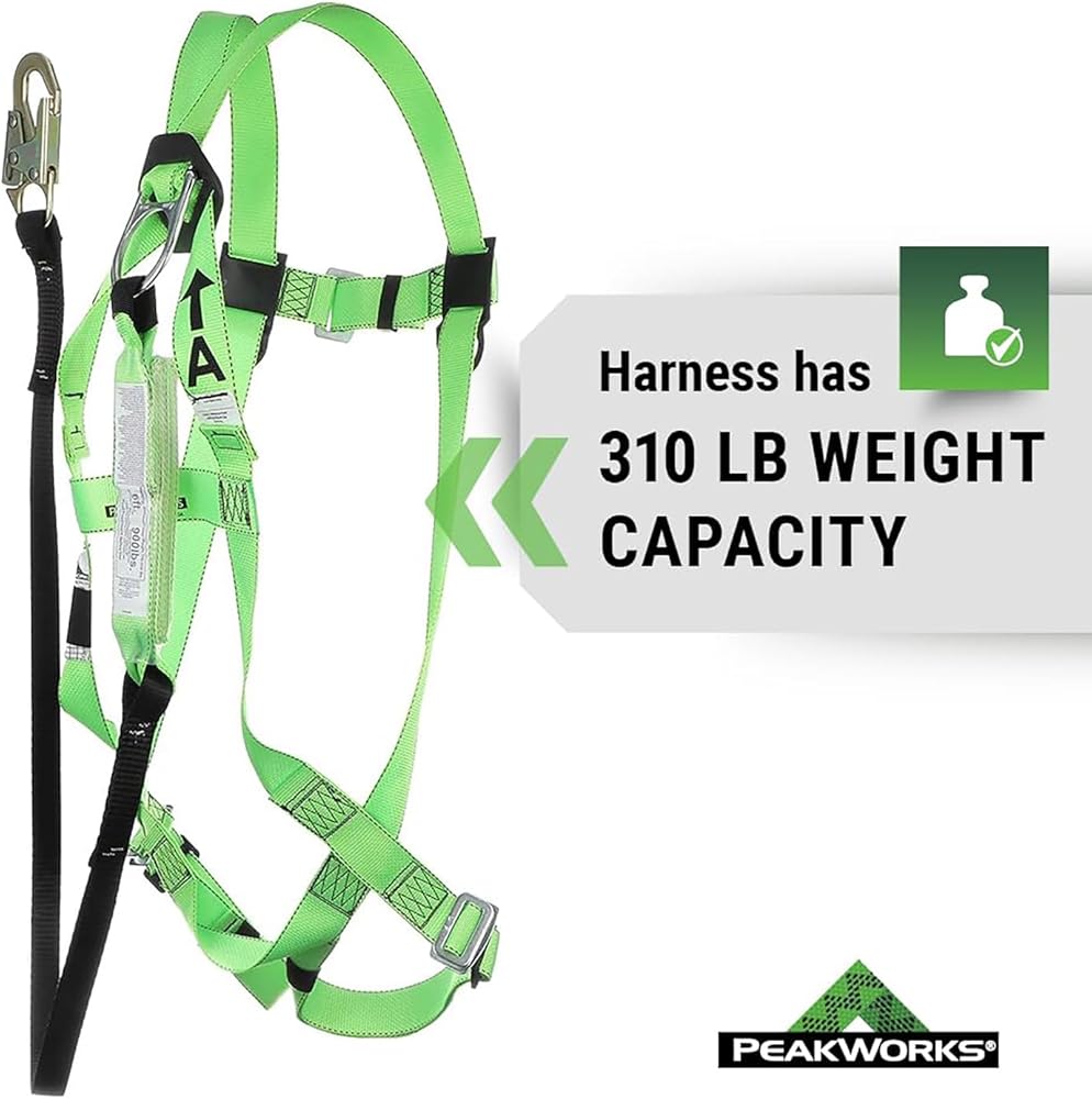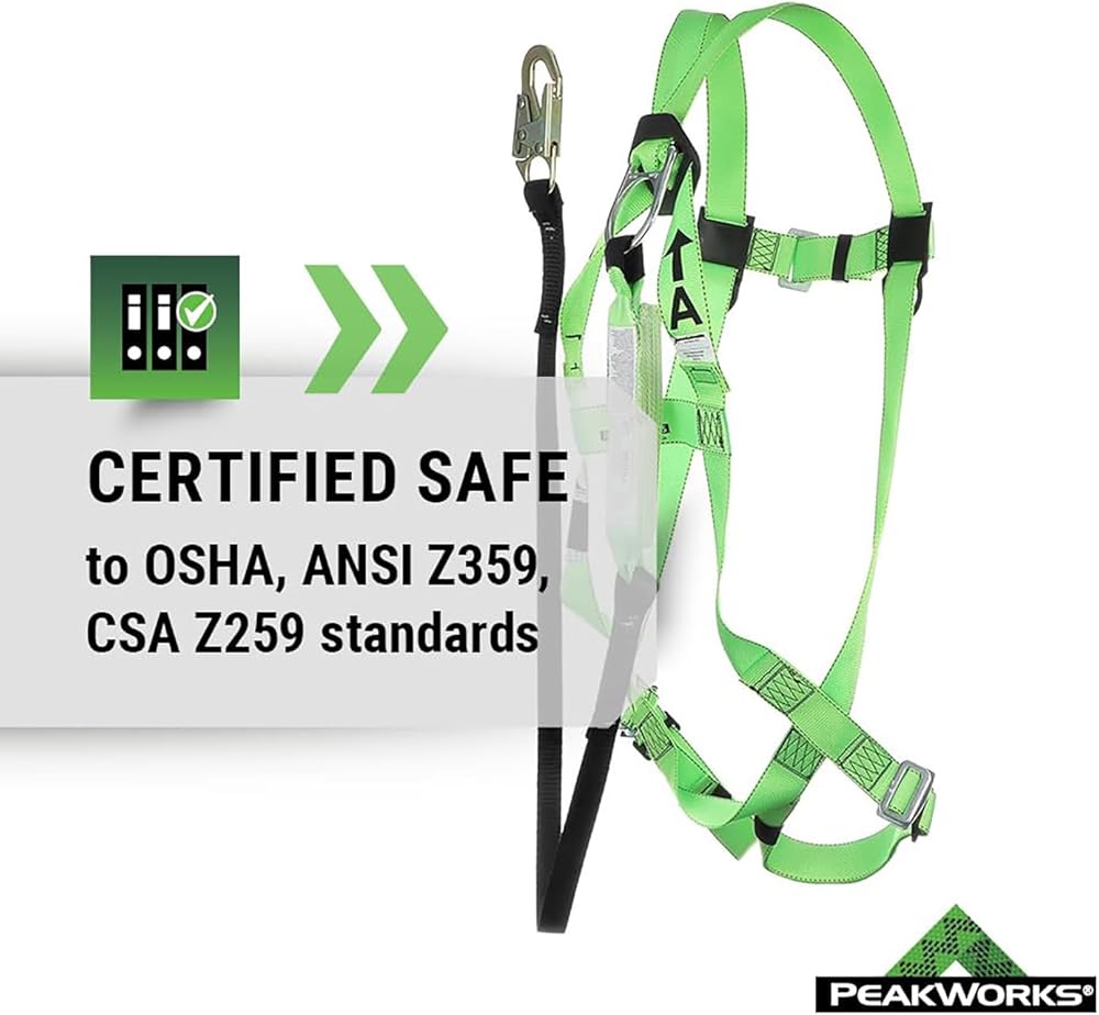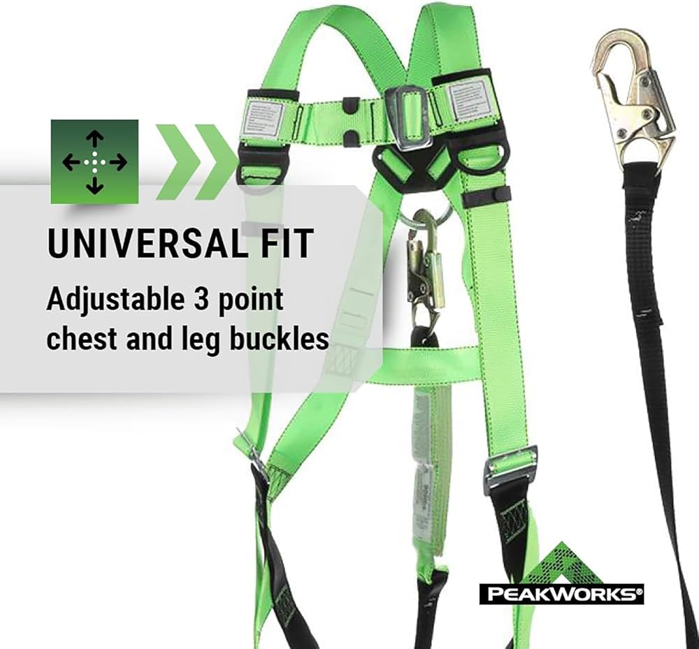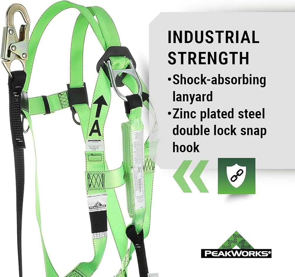 Falls are one of the top sources of injuries in the workplace, and each year, falls are responsible for hundreds of deaths in the construction field alone. Slips and falls can happen to anyone, whether it's from spillage on the floor or working from high heights. That is why it is increasingly important to put safety first with the best fall protection equipment. This PeakWorks Fall Protection Safety Harness Kit (Model V825236) comes in hi-vis green and has a 3 point adjustable harness in the chest and legs with a permanently attached, 6 foot shock absorbent lanyard, that is resistant to abrasion as well as UV rays. The Lanyard is comprised of “tear webbing” which will significantly limit and reduce the force of a fall on a worker. The quick connect chest and leg buckles allow for an adjustable fit for men and women of all sizes. This fall arrest system is ideal for a variety of at-height applications at an affordable cost. The PeakWorks Safety Harness Fall Protection Lanyard Kit is both OSHA and ANSI compliant.Established in 2008, PeakWorks has been passionate about providing workers peace of mind when working at heights. As a full service fall protection provider, our focus on productive solutions combines pioneering services with feature-rich products and safety. Our product portfolio includes industry-leading harnesses, belts, rescue products, retractable horizontal lifelines, and more. As active members of both the ANSI and CSA standards committees, we are committed to providing the safest and most advanced fall protection products in the industry.