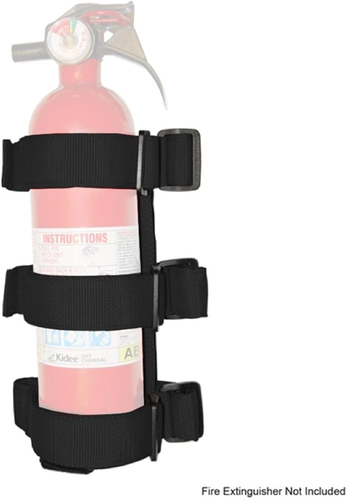 Special designed holder incorporates thick nylon web straps that secures your Fire extinguisher to the roll bar. Straps are fully adjustable and secure with hooks and loop fasteners. Holds one 3lb. Fire extinguisher (not included).