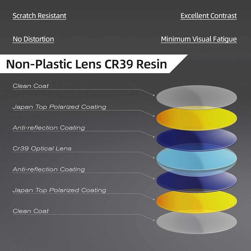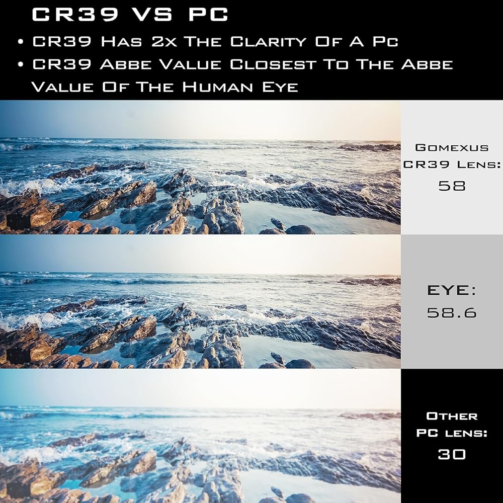 GLASS CLARITY: Gomexus Polarized Sunglasses feature CR39 optical lenses that are twice as optically clear as other plastic lens materials,providing glass-like clarity while our lenses are one-third the weight of glass lenses. For fishing enthusiasts it eliminates annoying glare in the water,protects your eyes from harmful UV rays,and ensures a clear view at all times during your fishing adventure.