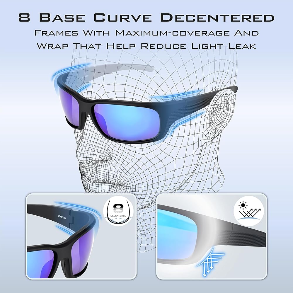 COMFORTABLE TO WEAR AND WON'T SLIP OFF: Gomexus sunglasses are designed to provide optimal coverage for anglers who prefer more protection from side light,and feature an 8 BASE CURVE DECENTERED design that ensures a comfortable,secure fit throughout the entirety of your outdoor activity and won't slip off.