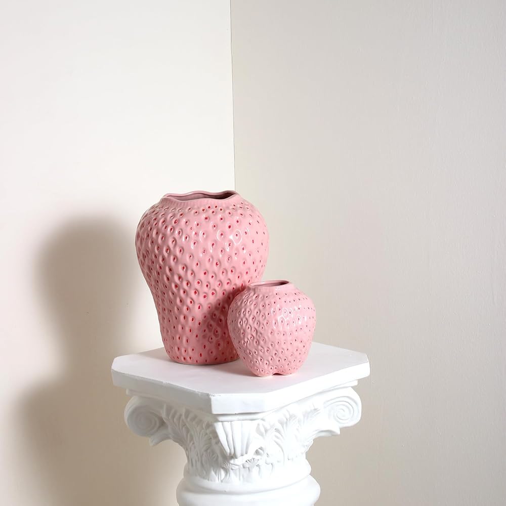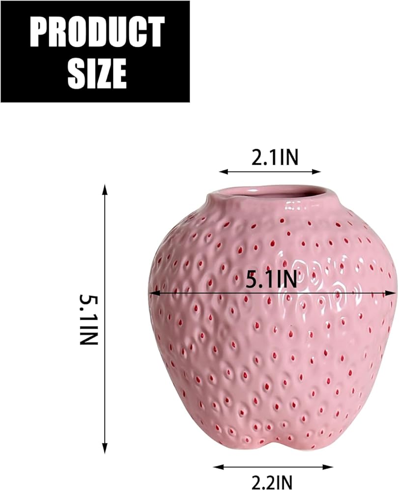 2 SIZE STRAWBERRY VASES: The large pink/red vase measure 9.8 x 8.3 inch, It is designed with a large stomach and a big round opening(4.1 inches), so it can hold a large bunch of flowers or plants. The small pink/red vase measure 5.1 x 5.1 inch, it is great for holding small flowers or use as a novelty ceramic storage tank. A cute home decor accent for your spaces.