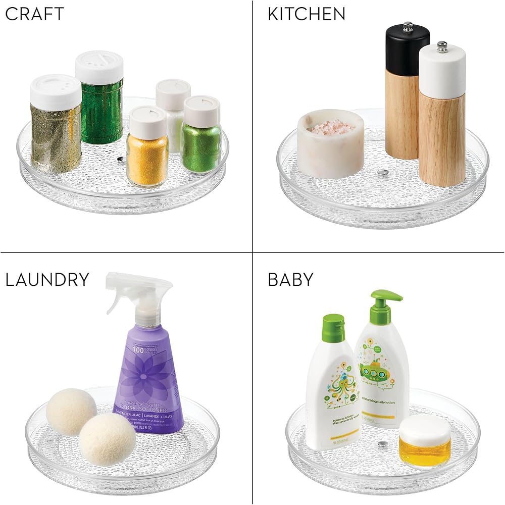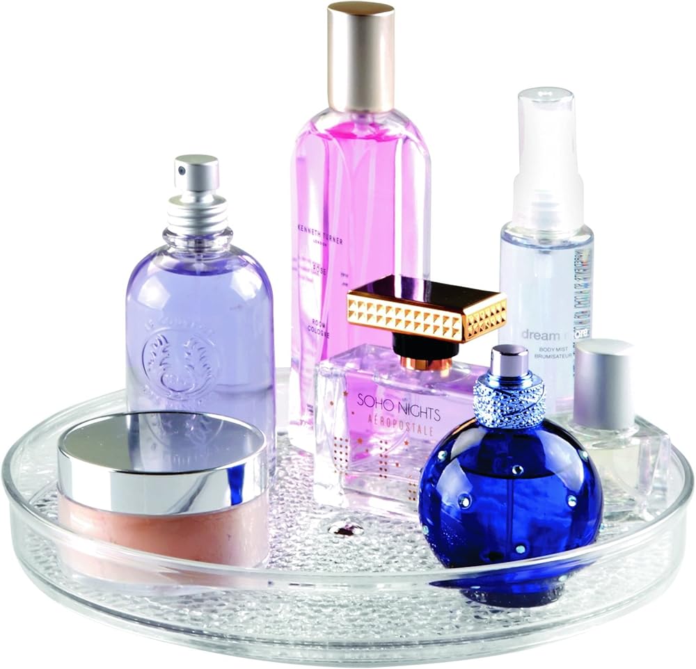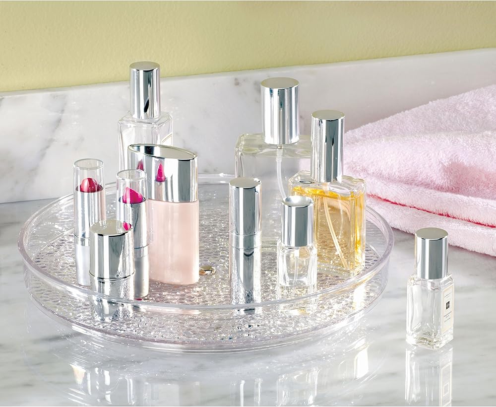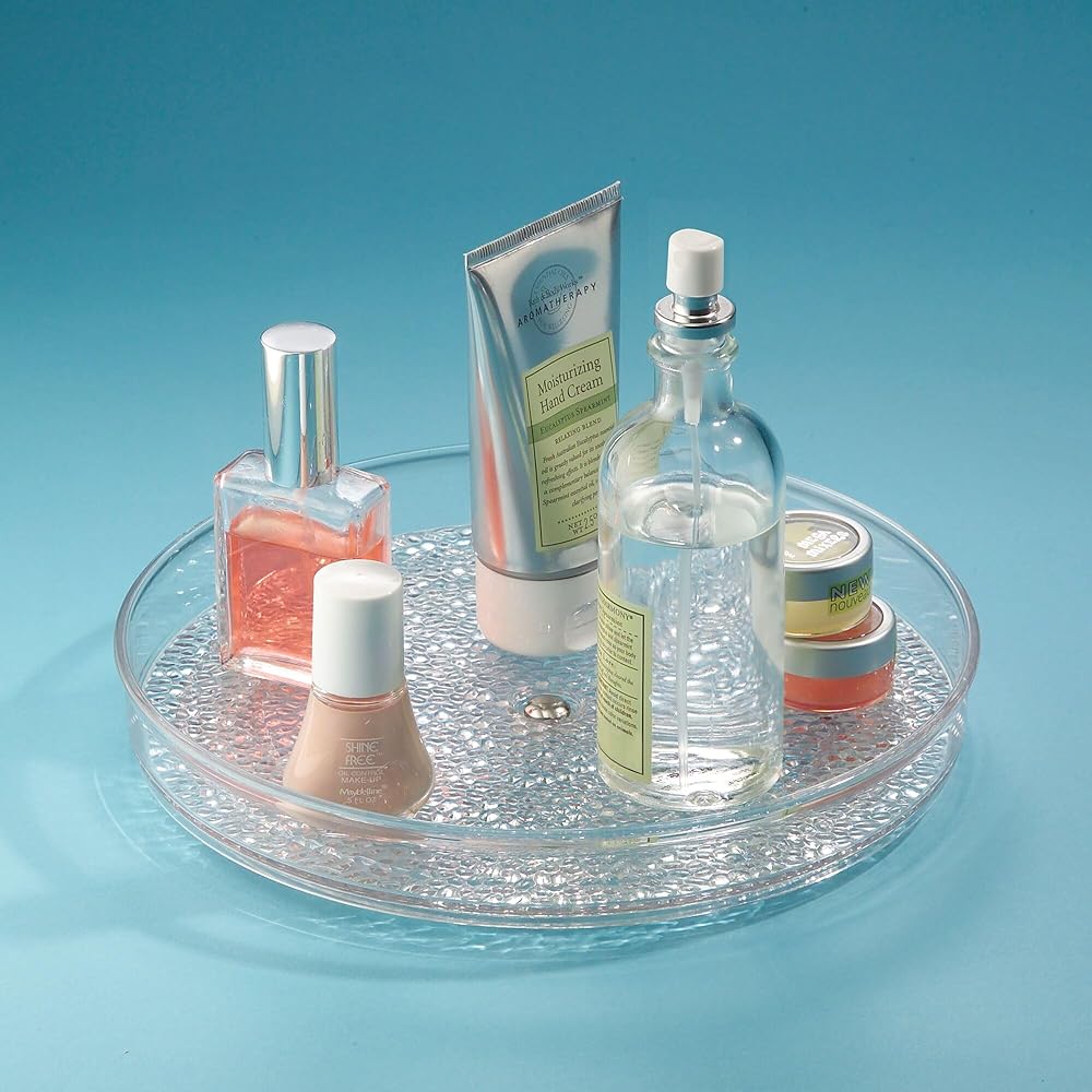 TURNTABLE ORGANIZER: The iDesign Turntable Organizer is ideal for storing cosmetics, hand lotions, makeup brushes, deodorants, medicine, jewelry, spices, tea, & other small items on vanities, bathrooms, countertops, college dorms, offices & craft rooms.