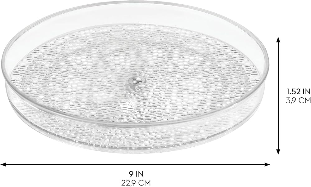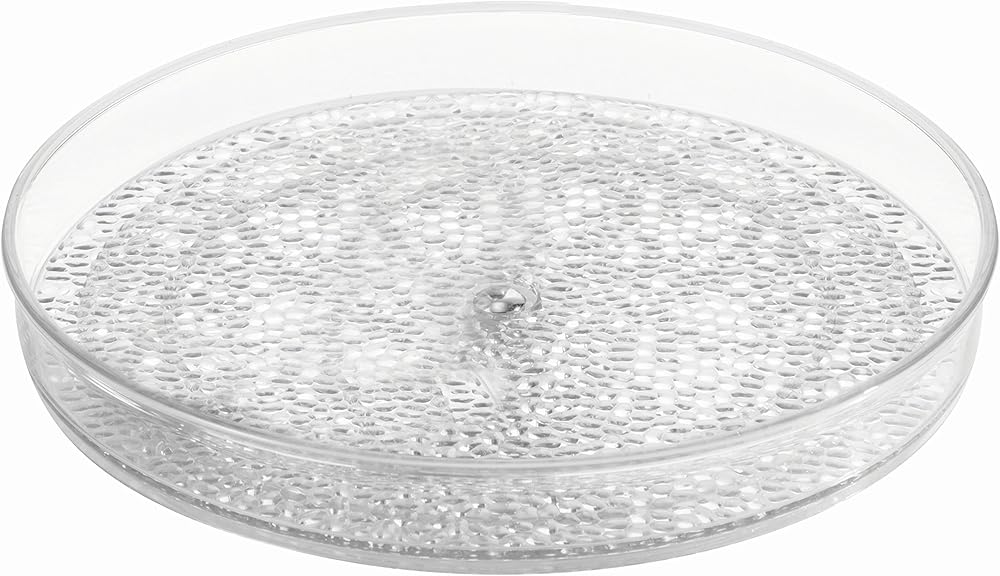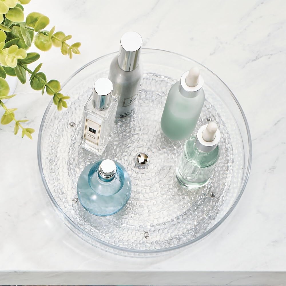 Upgrade your household storage with this iDesign Vanity Organizer. The plastic turntable spins smoothly to slowly bring the item you desire within easy reach. The clear lazy Susan turntable is perfect for storing cosmetics, hand lotions or soap, makeup brushes, deodorant, medicine, rings, earrings, bracelets, necklaces, and other small items. The raised edges prevent the contents of the tray from falling over. The plastic vanity organizer is made of clear and durable plastic that spins smoothly on stainless-steel ball bearings. Measuring 9" x 9" x 1.5", the iDesign Rain Vanity Spinner is the perfect addition to your home organization. With iDesign you can LiveSimply every day.