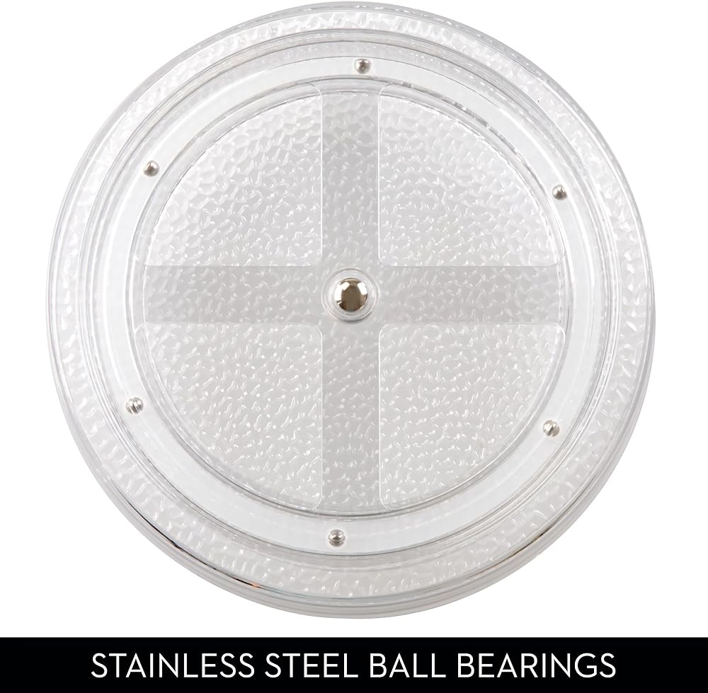 SMOOTH SPIN: This durable clear storage organizer features plastic construction that stands up to everyday use, with a stainless-steel ball-bearing bottom for easy spinning.