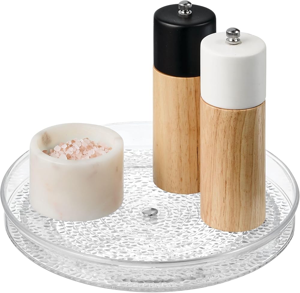 RAISED OUTER RIM: Along with an open design that keeps items visible and within reach, this plastic lazy Susan turntable features a raised outer rim to prevent items from falling out when spinning.