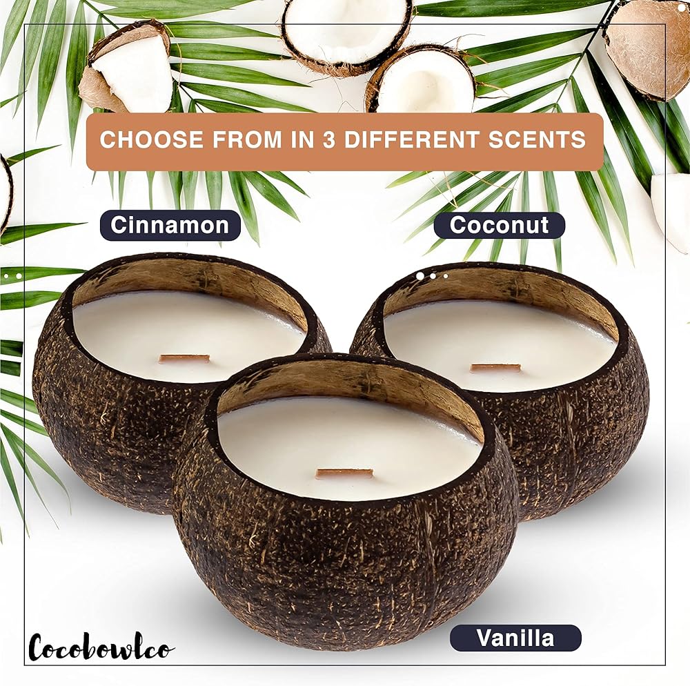 Cocobowlco's Eco-Friendly candles are hand poured into a real coconut shell using a naturally scented coconut-soy wax and feature a wooden wick that crackles when it burns.