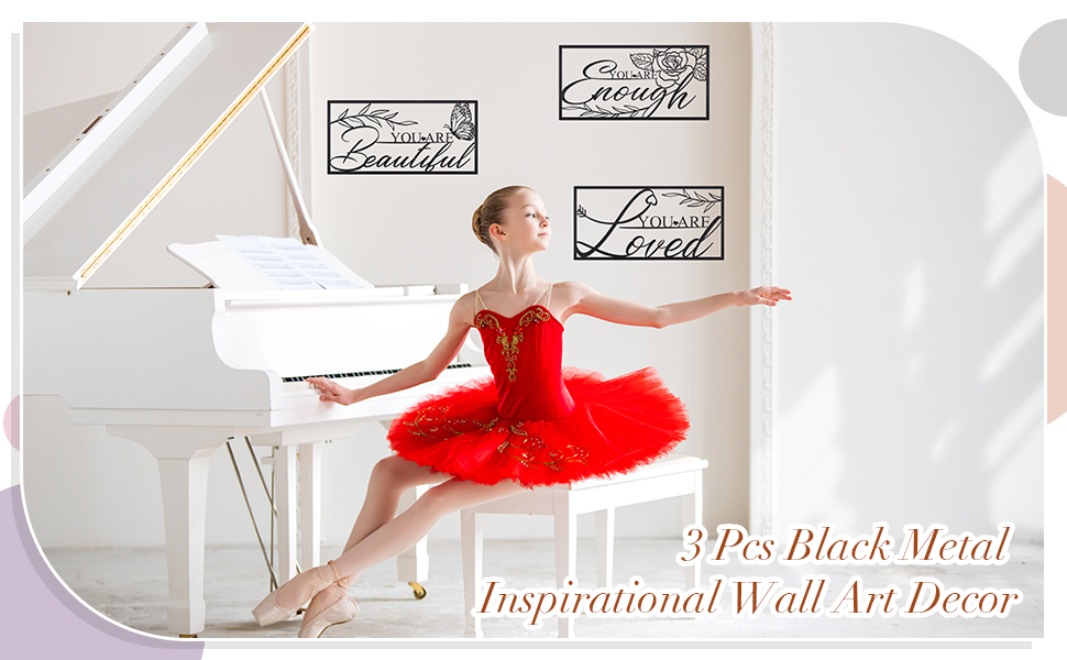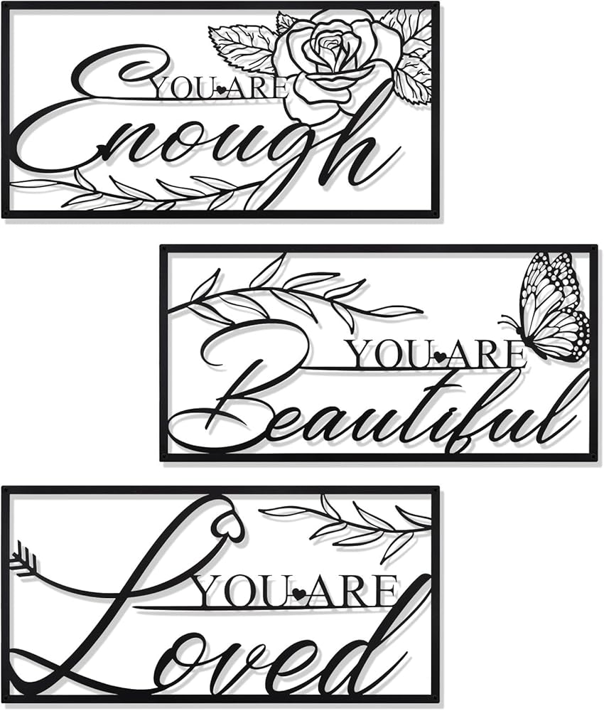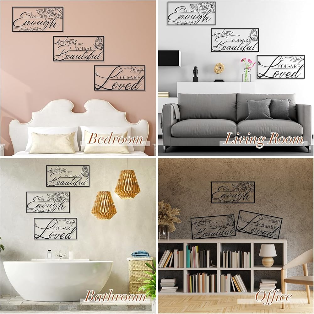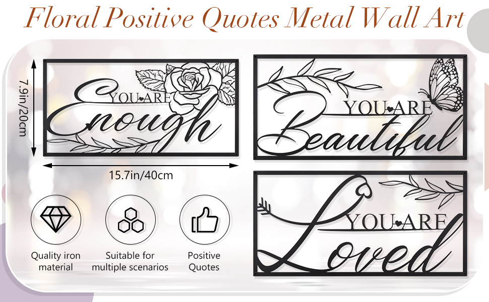 مجموعة ديكور حائط تحفيزية: سوف تحصل على 3 قطع من اللافتات المعدنية السوداء الإيجابية لديكور الحائط، مع 12 براغي، و12 أنبوبًا أبيض صغير، و12 أنبوب توسيع. مجموعة ديكور الحائط الفنية الخطية مطبوعة باقتباسات ملهمة وزهور جميلة، وورد، وفراشة، أوراق الشجر. كميات كافية وأنماط مختلفة لتلبية احتياجات الديكور اليومية للسيدات وفقًا للمواقف المختلفة.