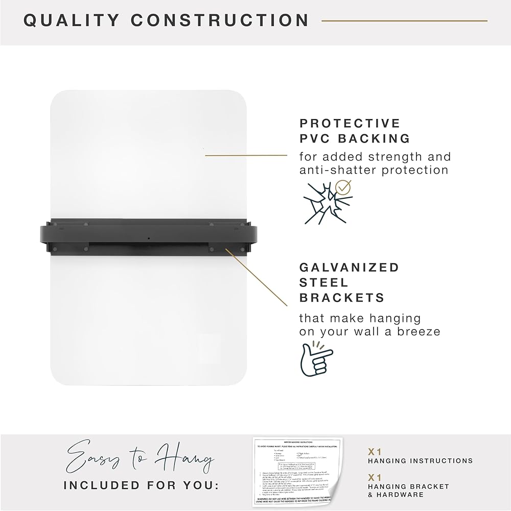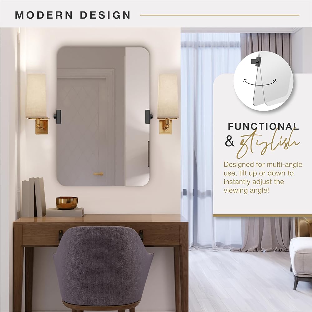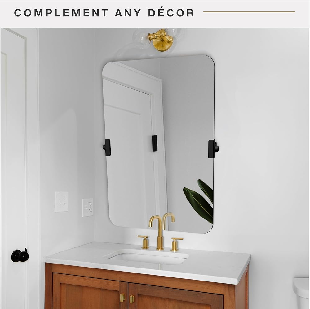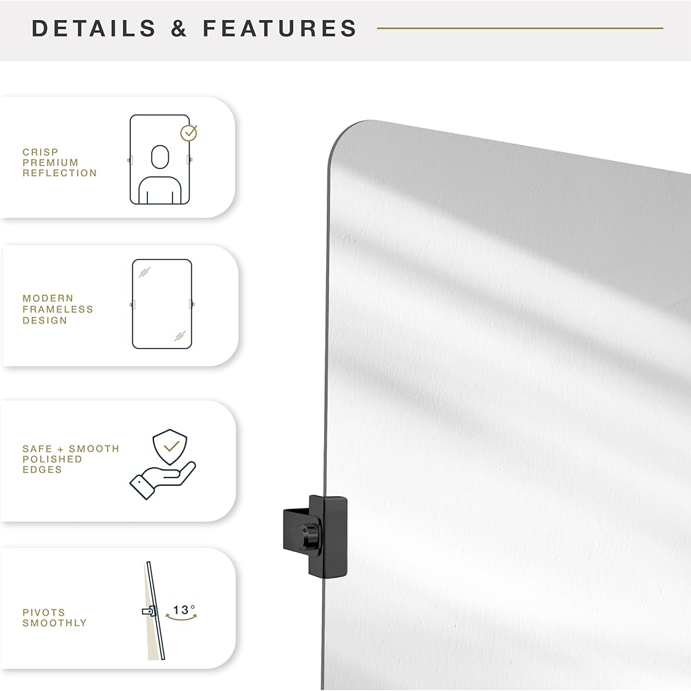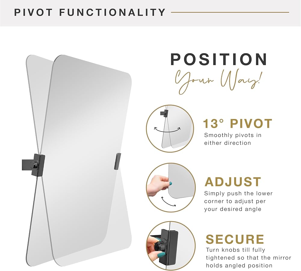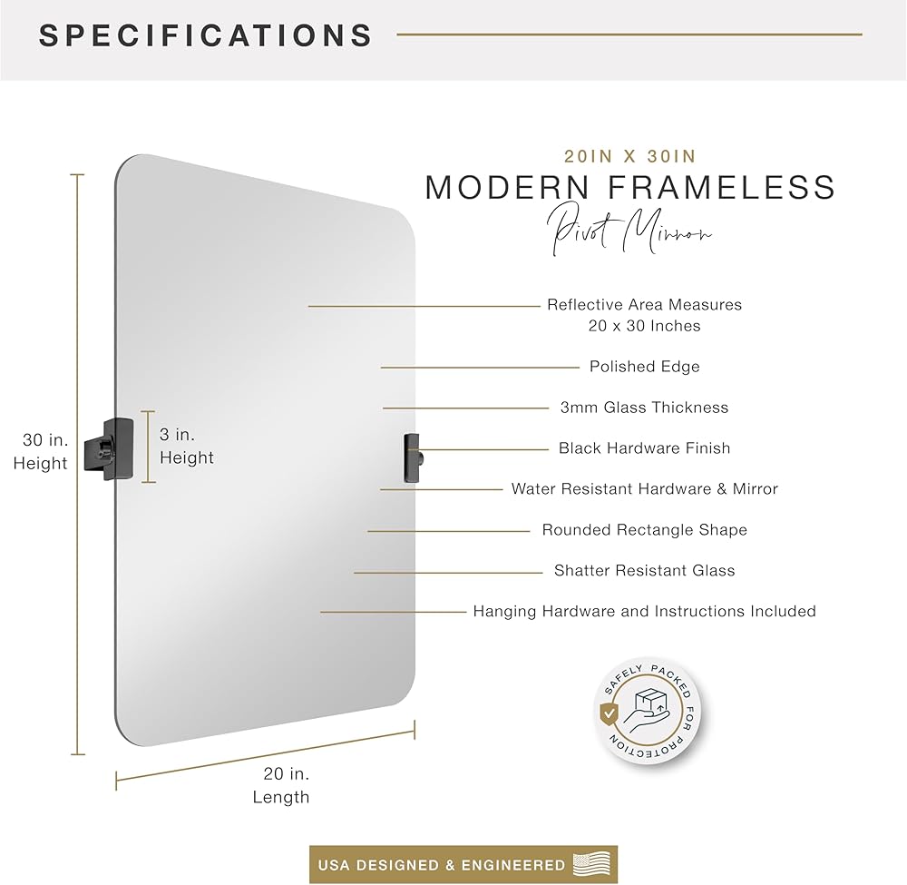 Elevate your space with the sleek charm of this beautifully designed 20" x 30" frameless pivot wall mirror! The MCS Modern Pivot Frameless Mirror combines clean aesthetics and superior craftsmanship to create a piece of truly seamless decor that will integrate beautifully in any home. This frameless bathroom mirror is complemented by black mirror hanging hardware that remains playfully visible on each side. Designed for easy hanging, this big mirror comes with a hanging bracket, the necessary hanging hardware, and complete instructions. Installation is a breeze, allowing you to effortlessly begin using this functional piece of bedroom, living room, and bathroom decor in your home. This pivot bathroom mirror can be adjusted up to 13°, allowing you to work with your best angles. Simply loosen the side knob to adjust, then tighten the knob to hold this bedroom mirror securely at your desired angle. From modern farmhouse to mid-century modern, this large bathroom mirror seamlessly blends in and enhances any room's decor style. Not only do our mirrors for walls add style and sophistication to your space, but they also create an illusion of spaciousness wherever they are placed. Crafted with utmost precision and a commitment to quality, the MCS Modern Pivot Frameless Mirror stands as a striking testament to fine design. With water-resistant hardware and shatterproof glass, the construction of this wall mounted makeup mirror is unmatched in quality. Add a touch of brilliance to your surroundings. Make a statement with the MCS Modern Pivot Frameless Mirror and let it be the centerpiece of admiration and conversation in your home.