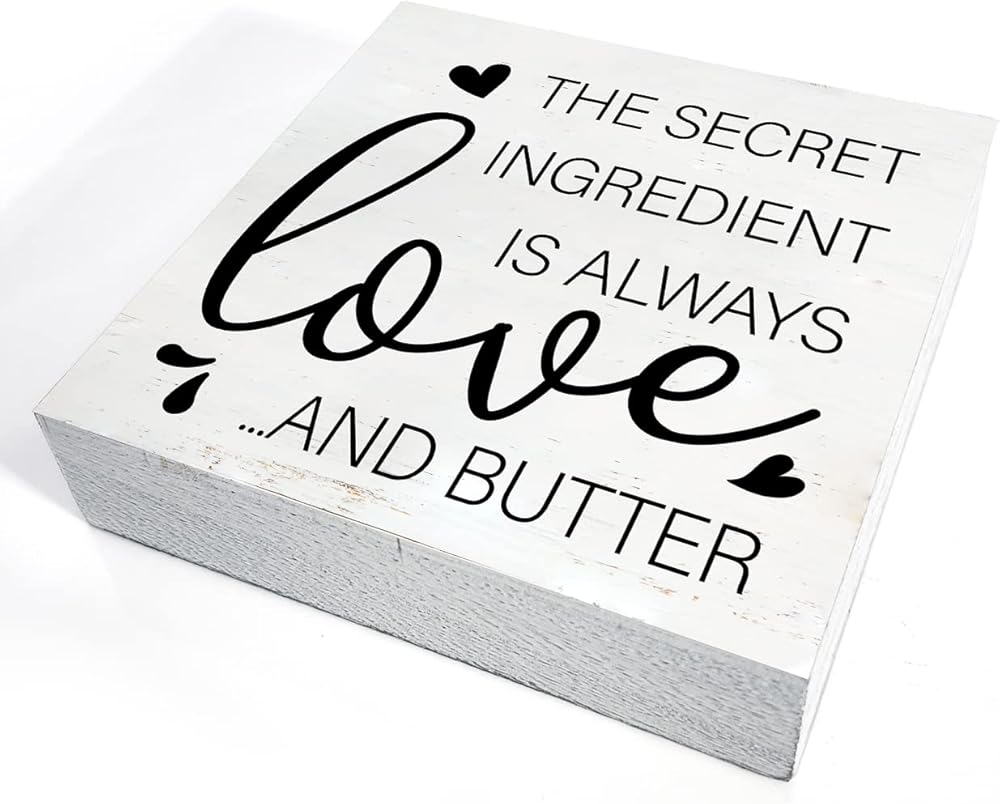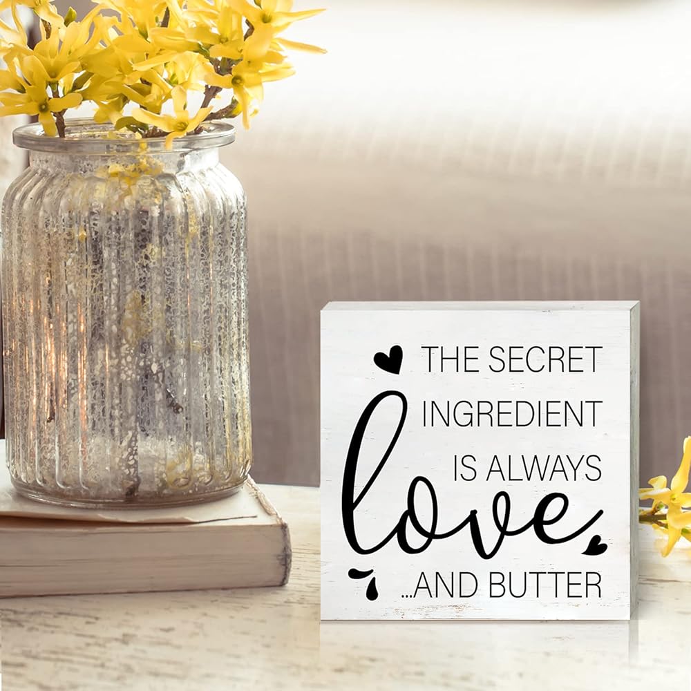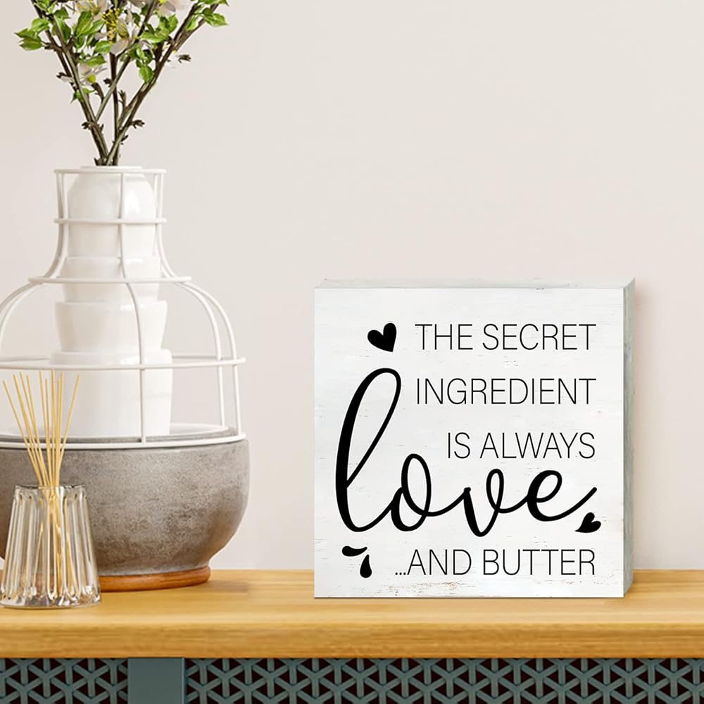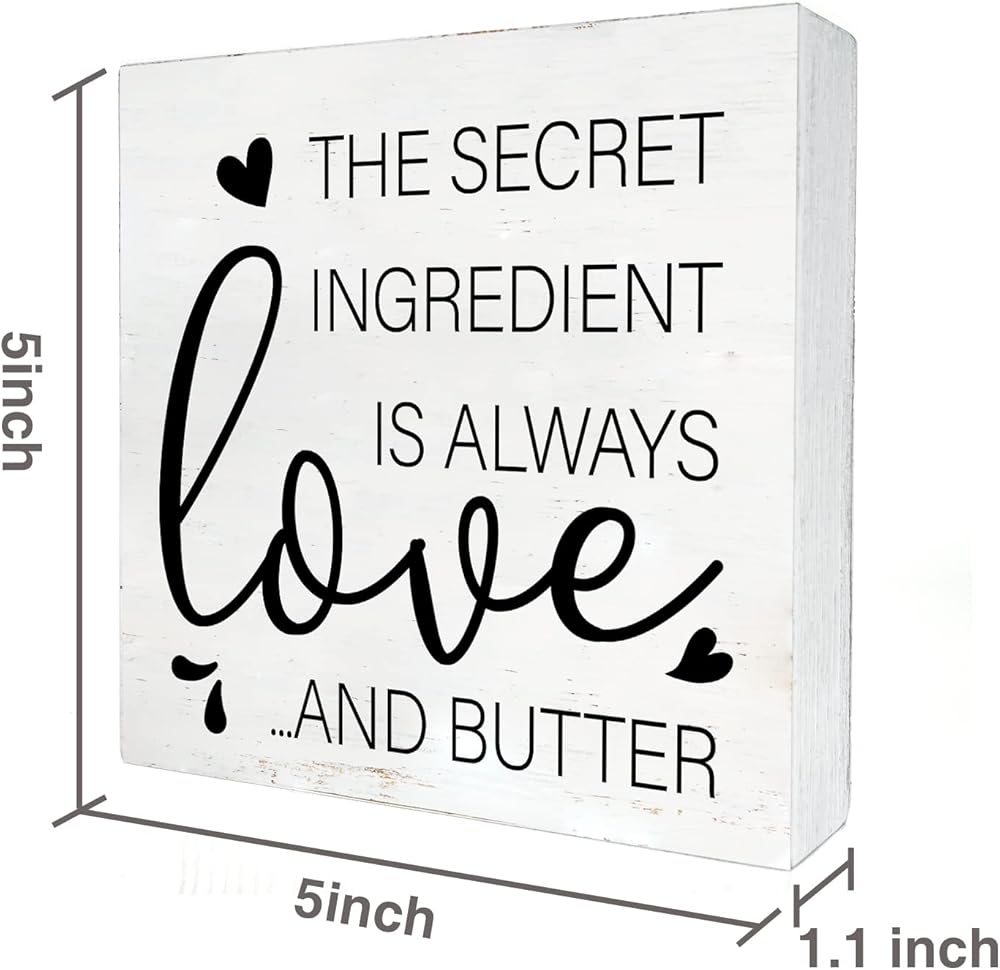 Modern Kitchen Wooden Box Sign with Saying Desk Decor 5 x 5 Inch the Secret Ingredient is Always Love and Butter Box Sign Wood Plaque Block Sign Rustic Home Dining Room Decor