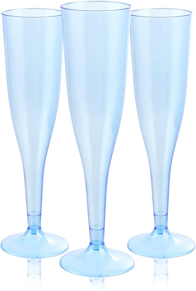 ENJOY YOUR PARTY: Our 7OZ blue plastic champagne flutes are ergonomically designed so that you can drink in great comfort and the champagne flutes are easy to assemble; the base and glasses fit snugly and the 2-pieces construction makes after-party storage a breeze.