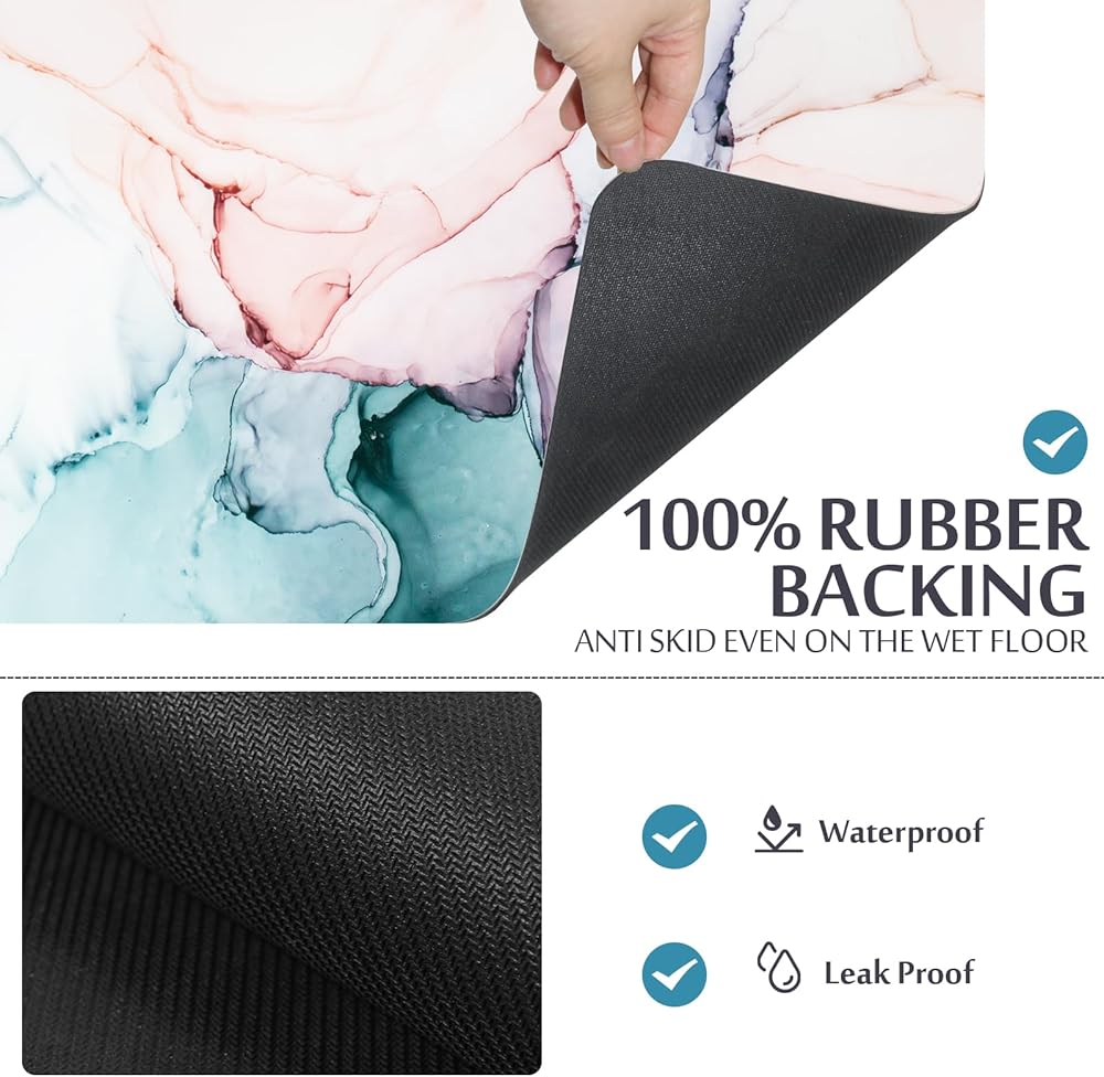Wide Use:This bath mat comes in stylish marble patterns and colors to decorate your bathroom, adding a pop of color to your decor.Further, the bath mat make a perfect gifting choice for your friends and family during Valentine's Day, Mother's Day, Father's Day or Halloween Day, Christmas Day, New Year's Day, or other special occasions.And the thin bathroom rug came rolled up, so it's flexible and light, not rigid, for easy put away if needed.