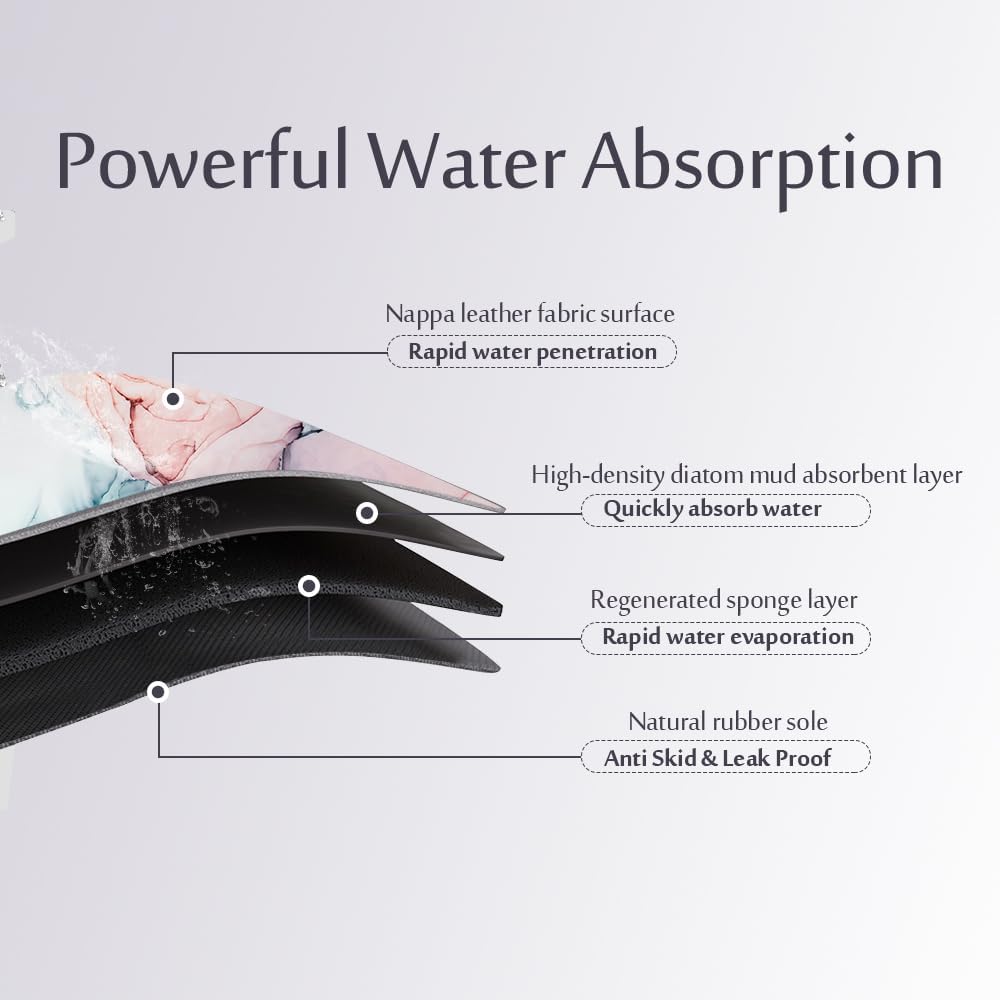 Fast Absorbing & Quick Drying:The mat is amazingly absorbent. The thin bathroom rug is avoid moisture, dust, dirt, and keeping floor clean and tidy and beautiful. The comfort bath mats for bathroom non slip has strong water absorption,durability and light weight. This is a soft version of the diatomaceous earth bath mat. The mat can suck up dripping water within 0.5 second.