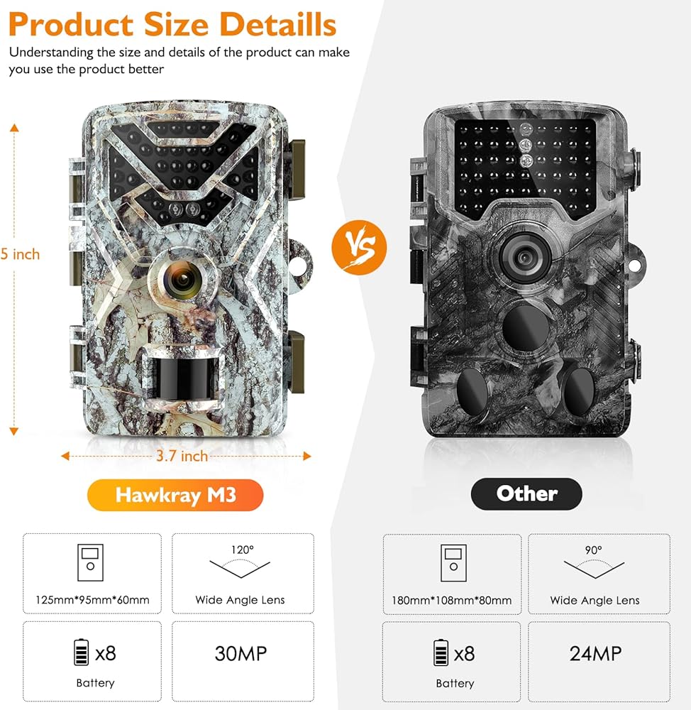 Hawkray Trail Camera 30MP 2K,Game Camera with Wide-Angle Motion Latest Sensor View 0.2s Trigger Speed 8 Batteries and 32GB SD Card 2'' HD TFT Screen Waterproof Cam for Wildlife Monitoring