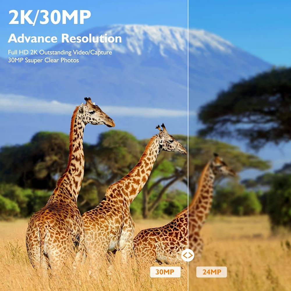 【2K Videos & 30MP Images】This trail camera presents more incredibly 2K ultra clear videos and 30MP vibrant images than the 1080P/24MP on the market. With 2K resolution, you can even clearly see the hair details of wildlife animals and various subtle movements that are difficult to capture, which enables you to closely observe and savor the original ecological world of wildlife by this game camera.
