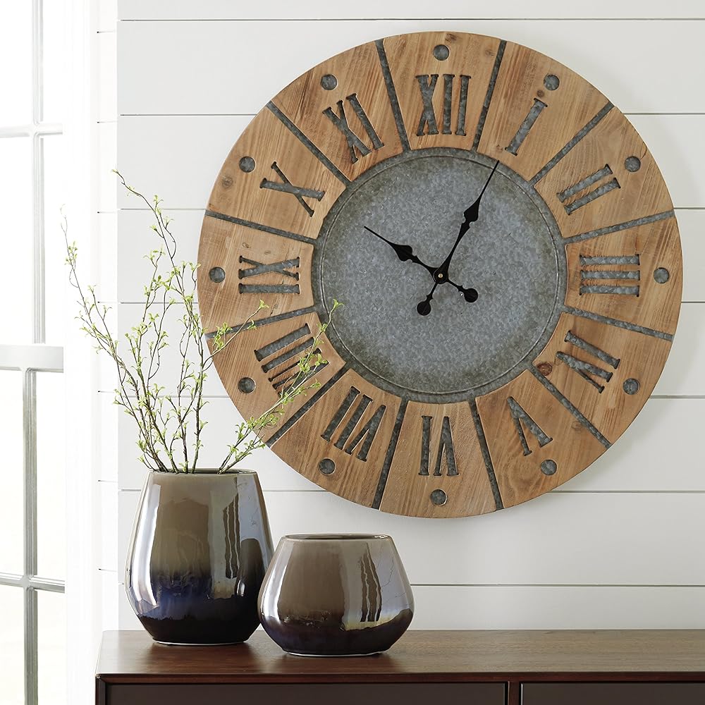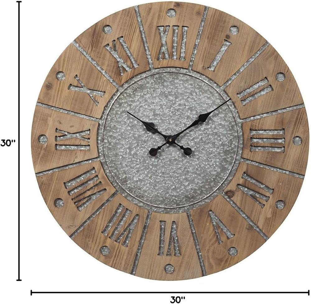 This wall clock is on time with industrial farmhouse style. Natural wood pairs beautifully with galvanized metal to create its large Roman numerals and sun design. The clock's ample scale makes it a gorgeous focal piece for your wall. Hanging up a clock is the easiest way to make an empty wall go from drab to fab. Wall decor can transform the feel of a room by making ceilings look higher, lines cleaner and spaces feel even bigger. With our accents, your walls can have interesting visuals and images that reflect many aspects of your life and personality. And we go the extra mile to package, protect and deliver your purchase in a timely manner.