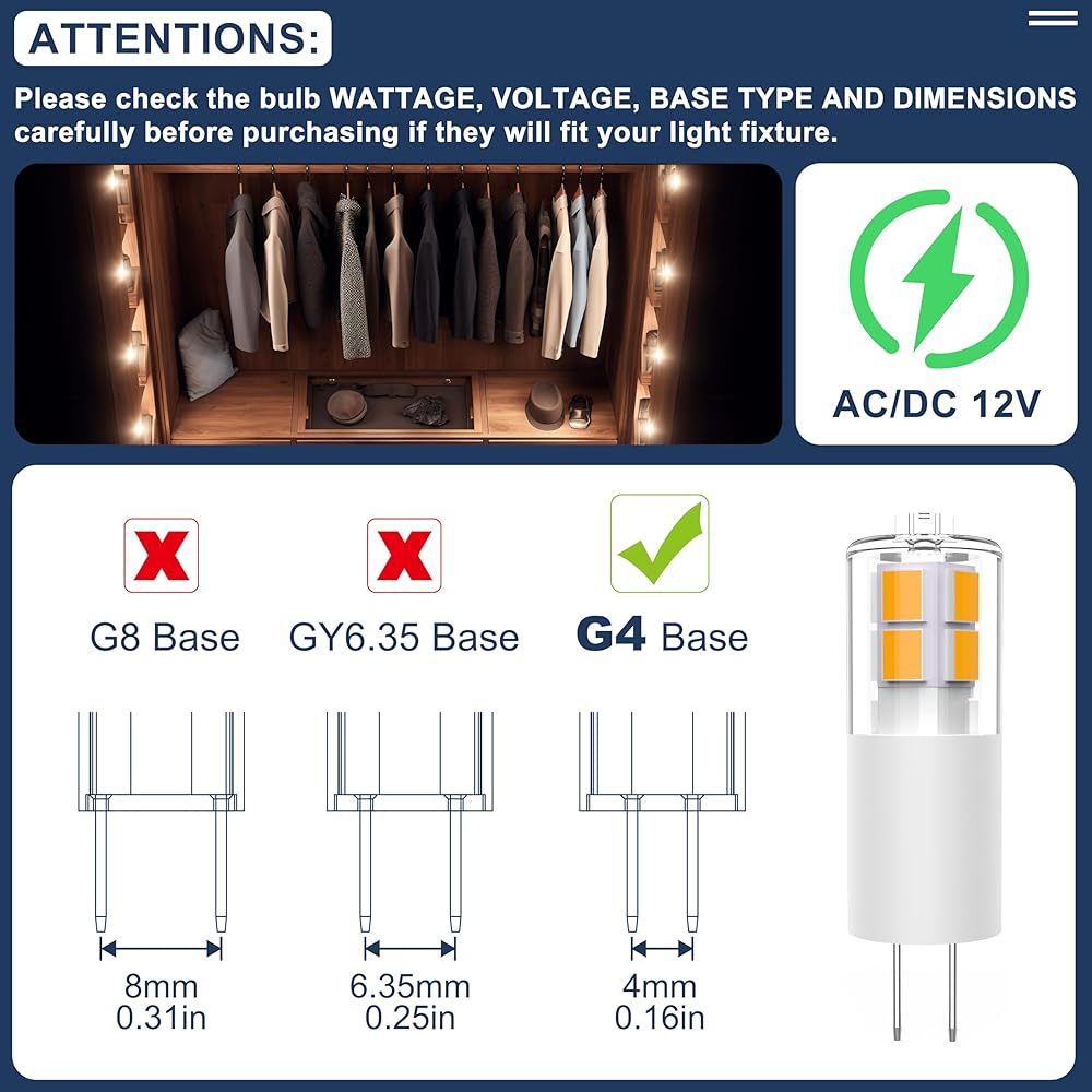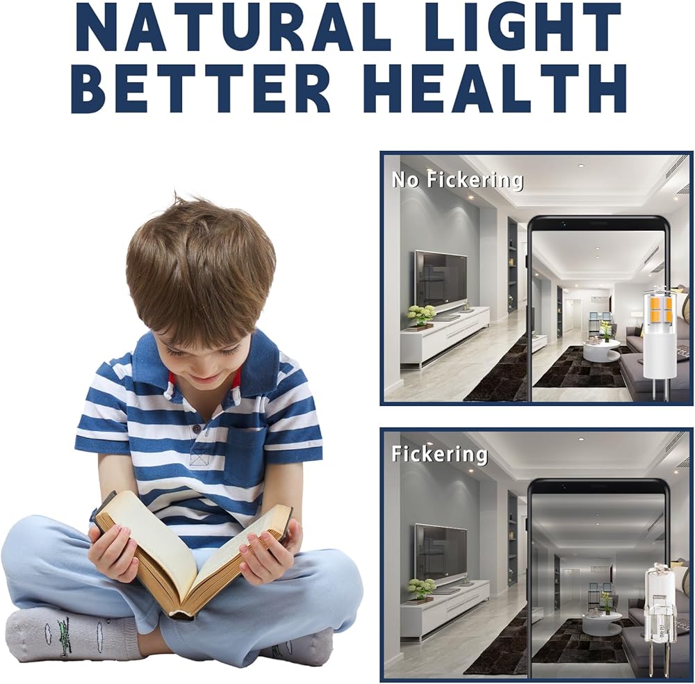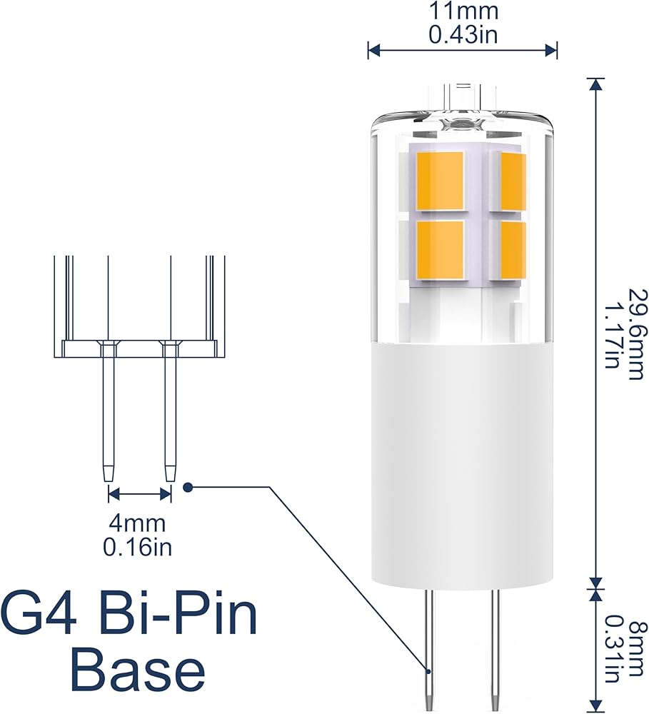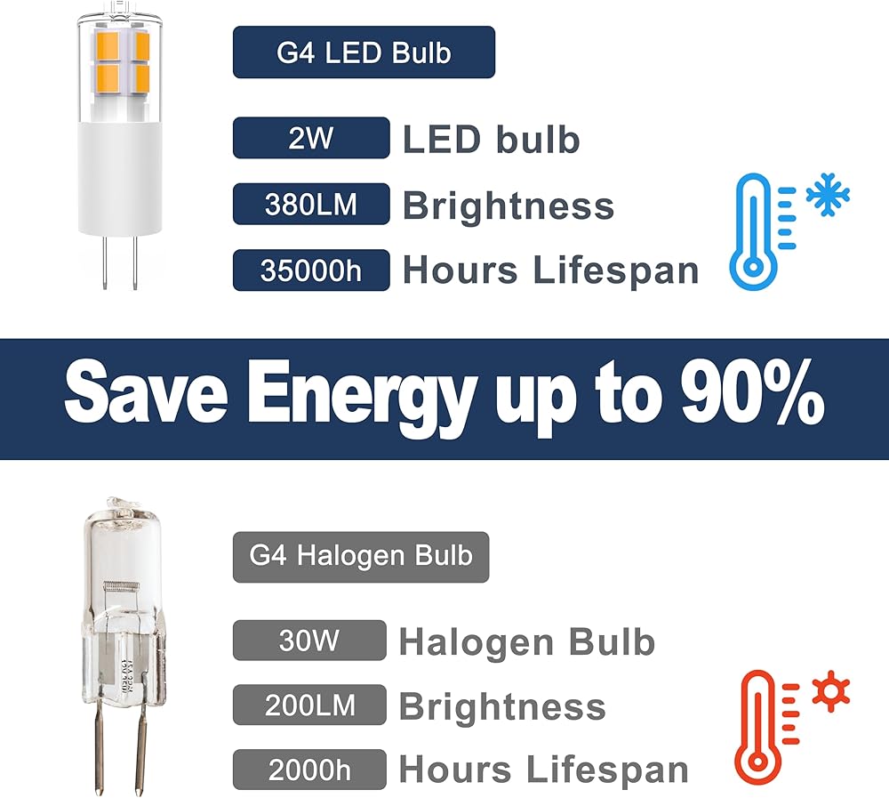 High-Efficiency G4 LED Bulbs: Upgrade to energy-saving 3W soft white LED bulbs that deliver 380 lumens of brightness, equivalent to 30W halogen bulbs, and save up to 90% on energy costs.