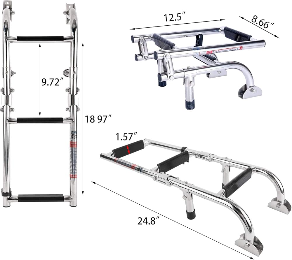 【3-Step Boat Ladder】The folded size of this marine ladder is approximately 12”(length) x 8.66” (width). The max length of the expanded ladder reaches to approximately 24”. The steps measures about 7” in width.