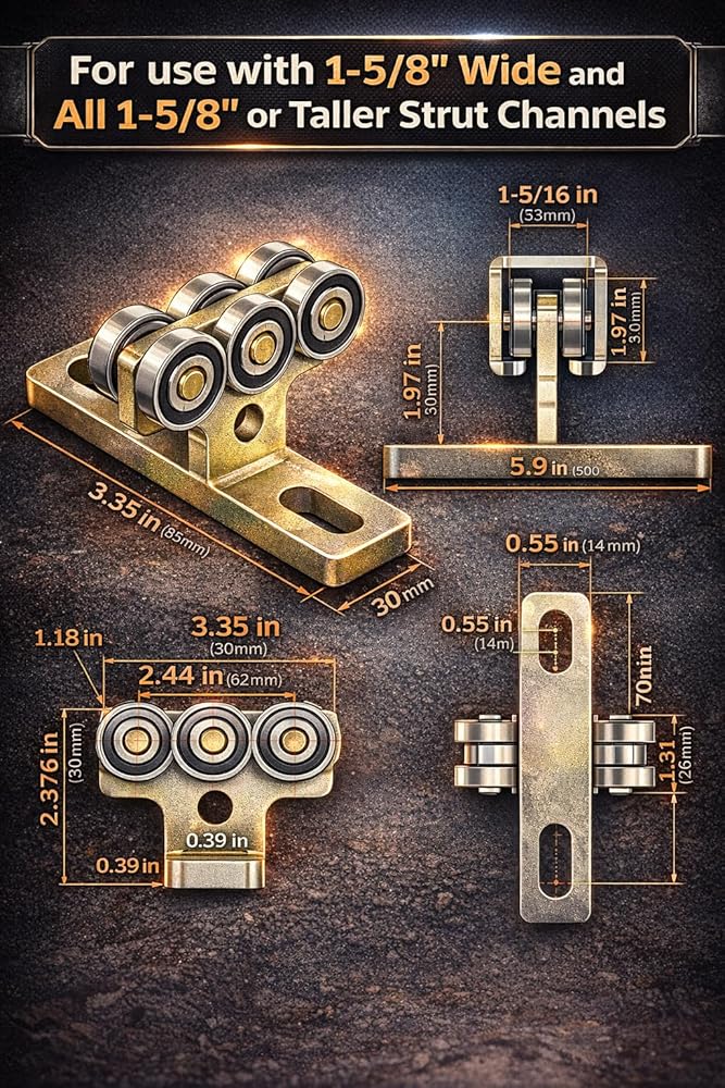 ✪Trolleys Size:Steel plate hole diameter-9/16”(14mm); thickness-2/5" (10mm).For use with 1-5/8" Wide and All 1-5/8" or Taller Strut Channel.