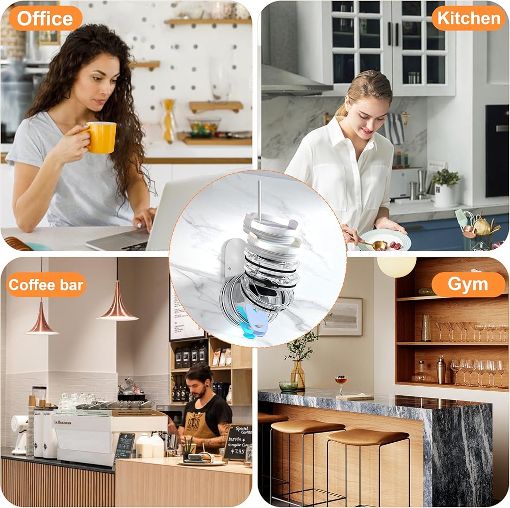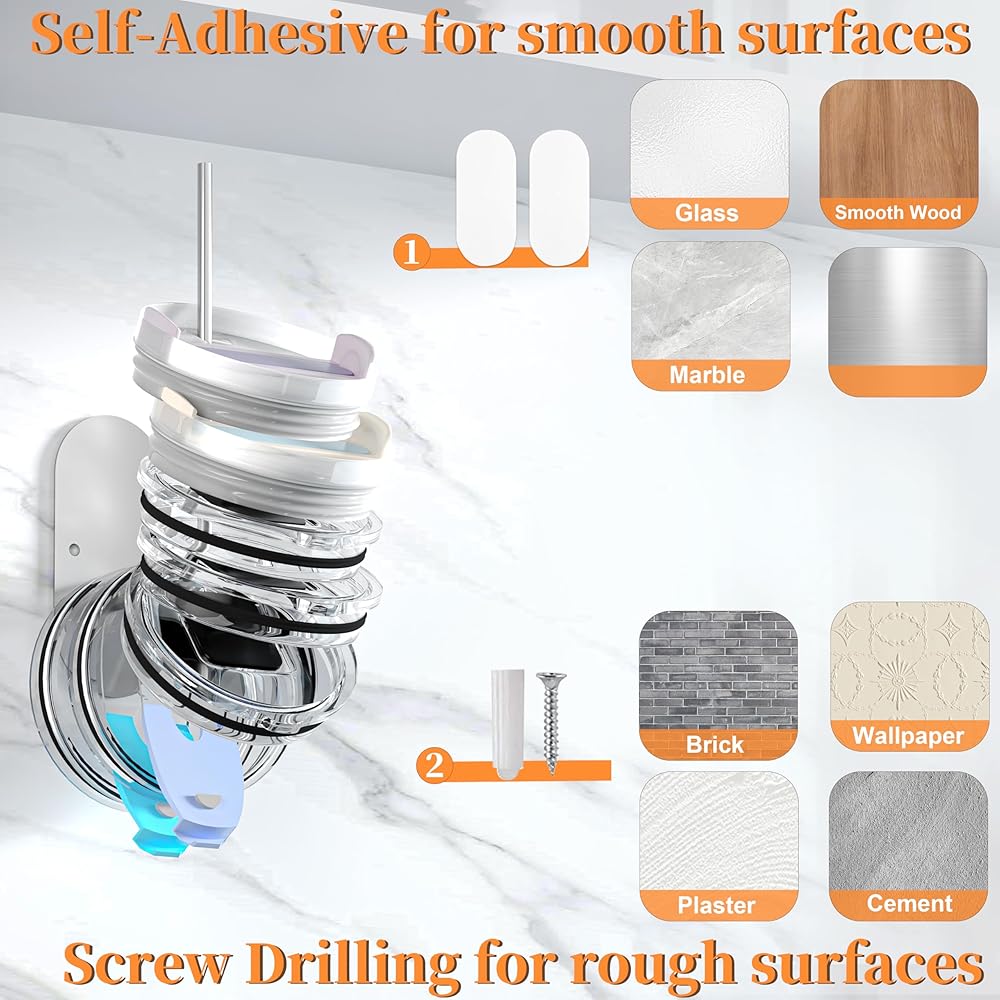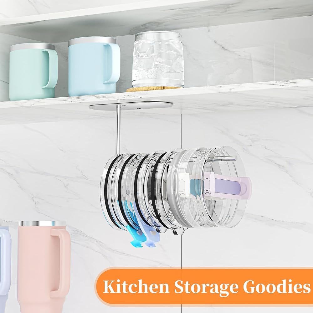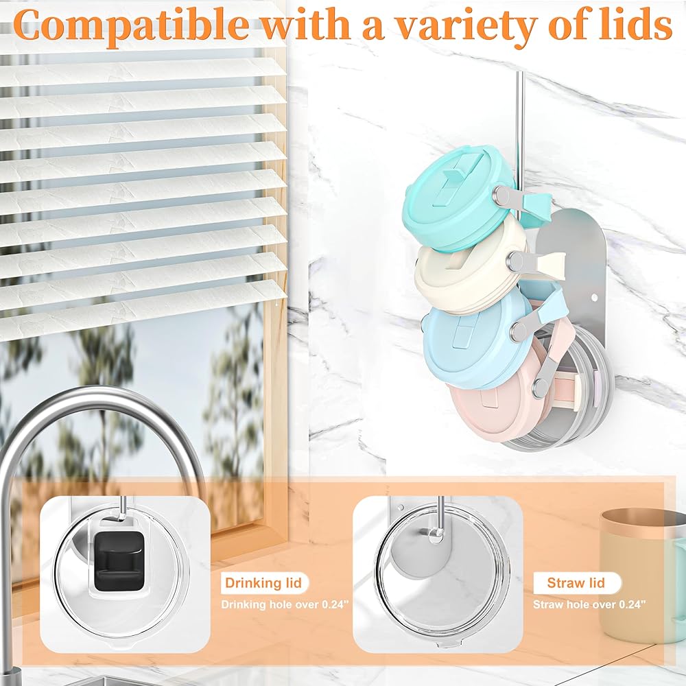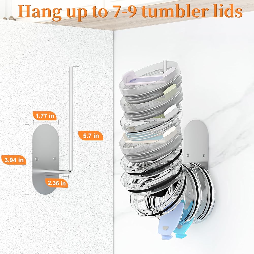 Premium Quality: The cup lid organizer is made of high-quality stainless steel, sturdy and durable, equipped with strong adhesive tape and screws, capable of holding 4-6 Stanley tumbler lids or 8-10 Yeti lids.