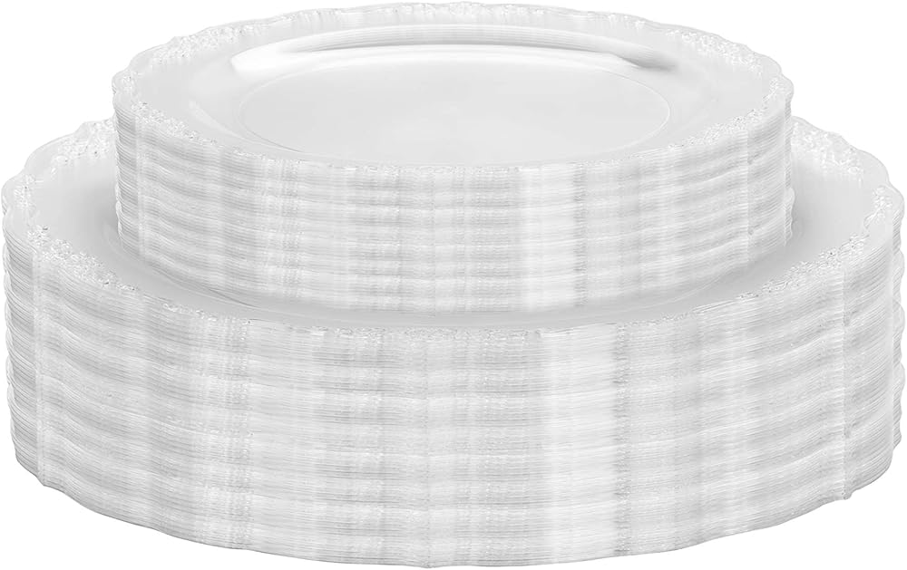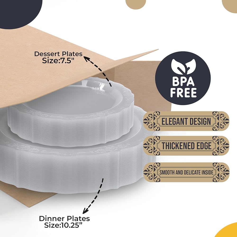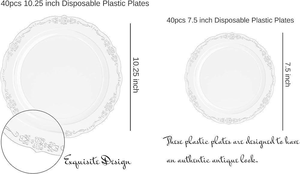 INCLUDES: Charger plates set comes with 40 pcs of 7.5 inch salad plates and 40 pcs of 10 inch plastic dinner plates disposable plastic plate set that will impress your guests - our elegant disposable dinnerware set will add a touch luxury to your next event or dinner party