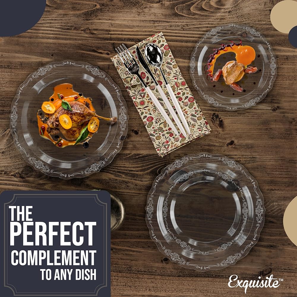 HEALTH & SAFETY: Our plastic disposable fancy plastic plates are not only convenient and time-saving but also 100% BPA-free, meaning they do not contain the harmful chemical bisphenol-A. The upscale disposable dinnerware are made with non-toxic materials, ensuring that no harmful chemicals will leach into your food. Plus, they are food safe, so you can use them with confidence knowing that they will not affect the taste or quality of your food