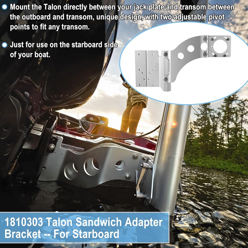 Unique Talon Mounting Bracket: Mount the Talon directly between your jack plate and transom or between the outboard and transom, unique design, with two adjustable pivot points to fit any transom. For use on the port side of your boat only.