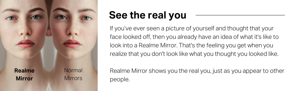 • غير قابلة للعكس: مرآة Realme لا تقلب الجانبين الأيسر والأيمن، على عكس المرايا العادية. إذا كنت قد رأيت نفسك فقط في المرايا العادية، فأنت لم ترى وجهك الحقيقي أبدًا. انظر لنفسك بالطريقة التي يراك بها العالم!