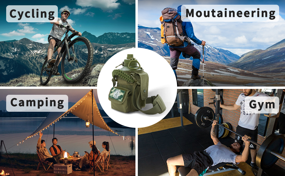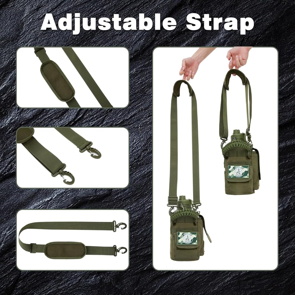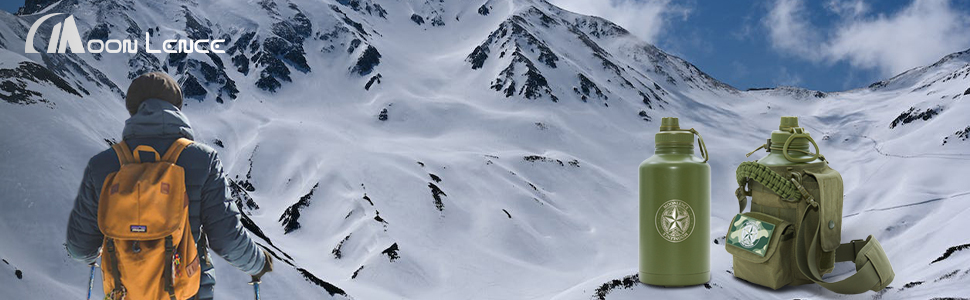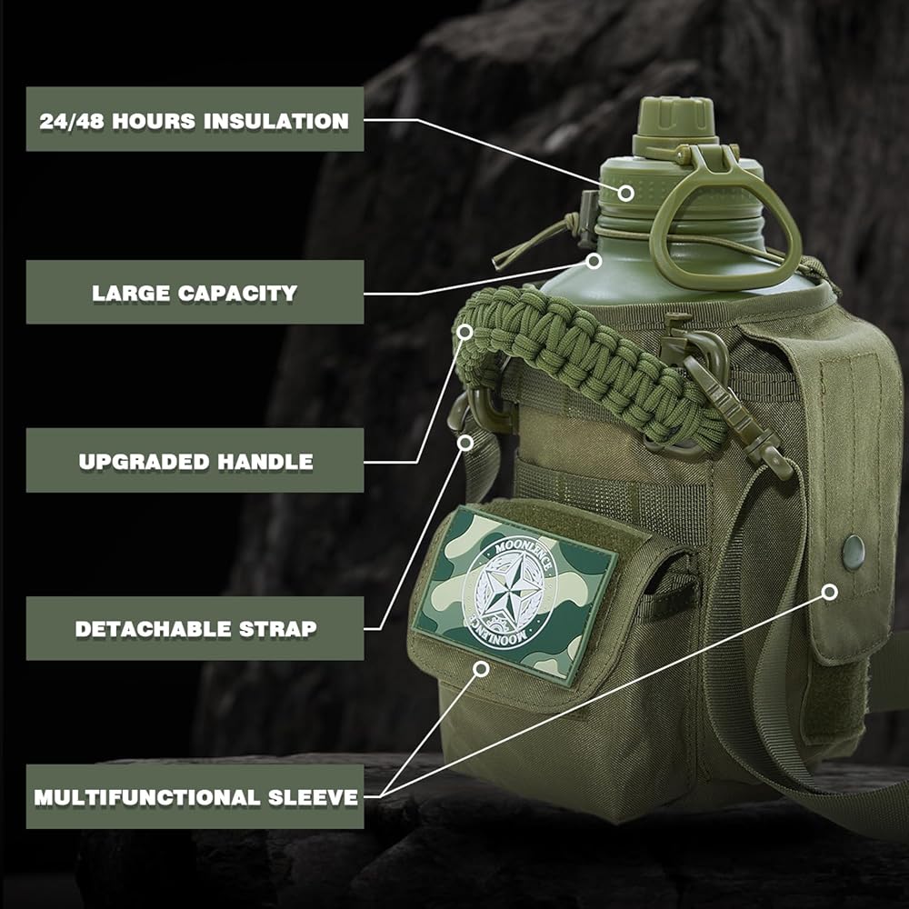 【64 Oz Large Capacity Design】The wide-mouth design of this military-style insulated water bottle easily accommodates ice cubes and simplifies cleaning. Whether you're engaged in fitness workouts, hiking, camping in the wilderness, embarking on hunting expeditions, work, or outdoor training, this 64 Oz (half-gallon) generous capacity caters to your hydration needs. No more frequent refills, allowing you to focus on savoring every adventurous moment.