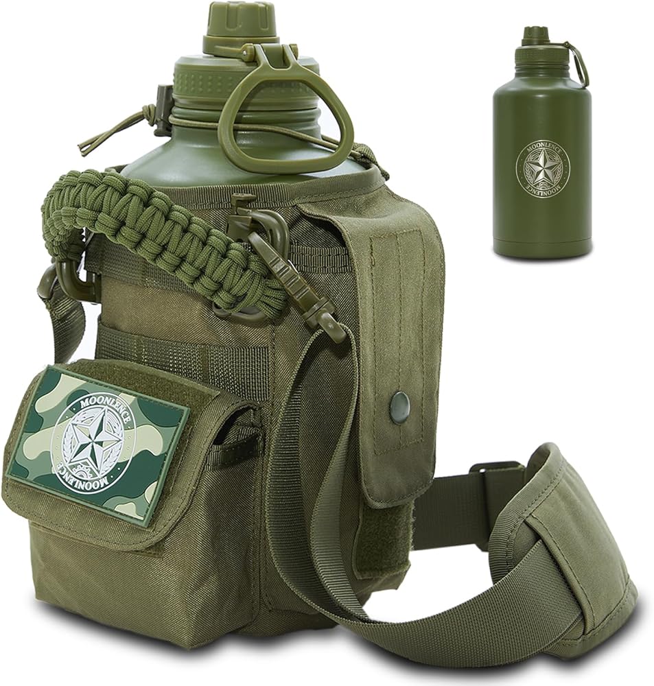 MOON LENCE 64 Oz Insulated Water Bottle Half Gallon Water Jug with Adjustable Strap - Stainless Steel Military Thermal Water Bottles with Paracord Handle for Men Hunter Green 2 Litres