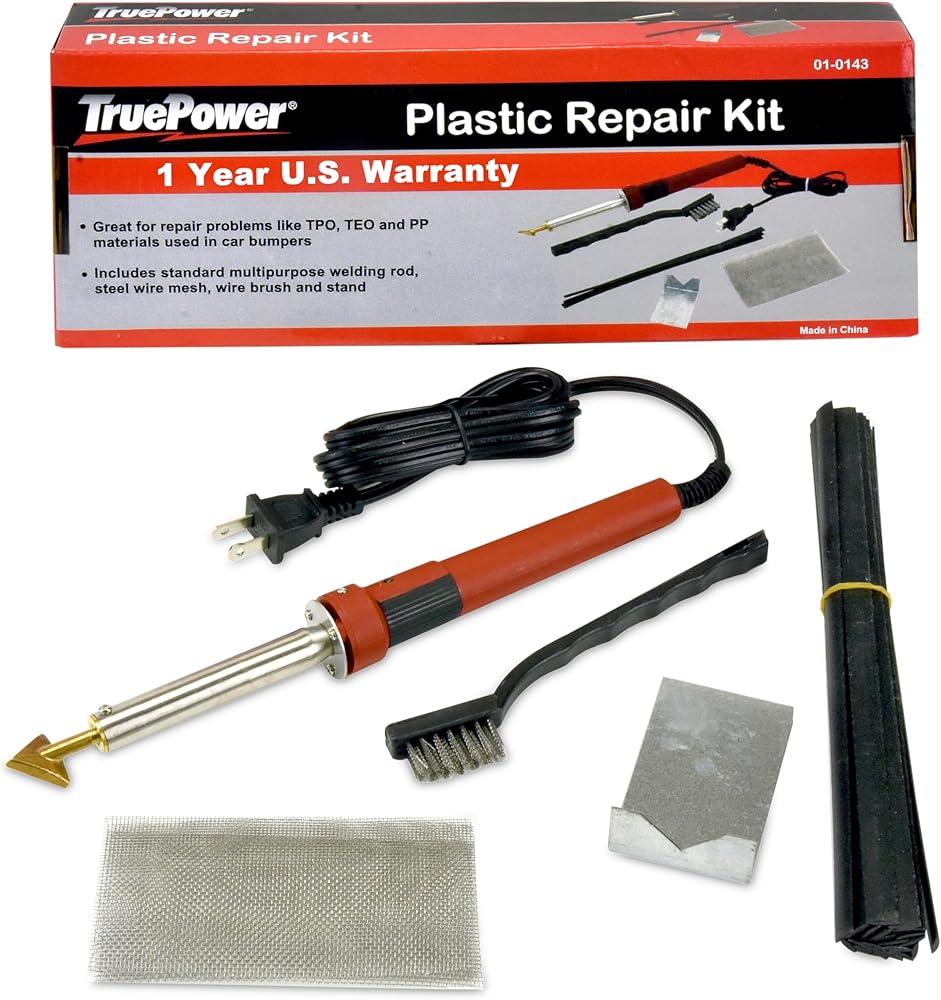 KIT INCLUDES - The TruePower Plastic Welder Kit includes: The Welder, Plastic Rods, Welder Tip, Reinforcing Stainless Steel Wire Mesh, Heat Stand, Wire Brush
